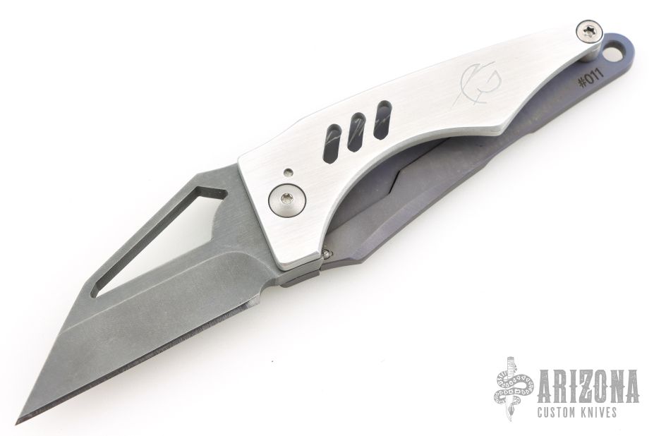 This Kolibri Framelock by Scorpion 6 Knives features an acid stonewashed wharncliffe blade with thumbhole. The handle has an aluminum and laser engraved titanium frame with a lanyard hole at the butt. Rides on phosphor bronze washers, nice detent, lockup and blade seating. Comes with original zippered and card dated March 2025 and #011. Has a couple light scratches, otherwise excellent condition.