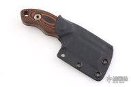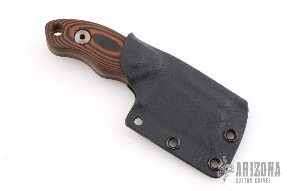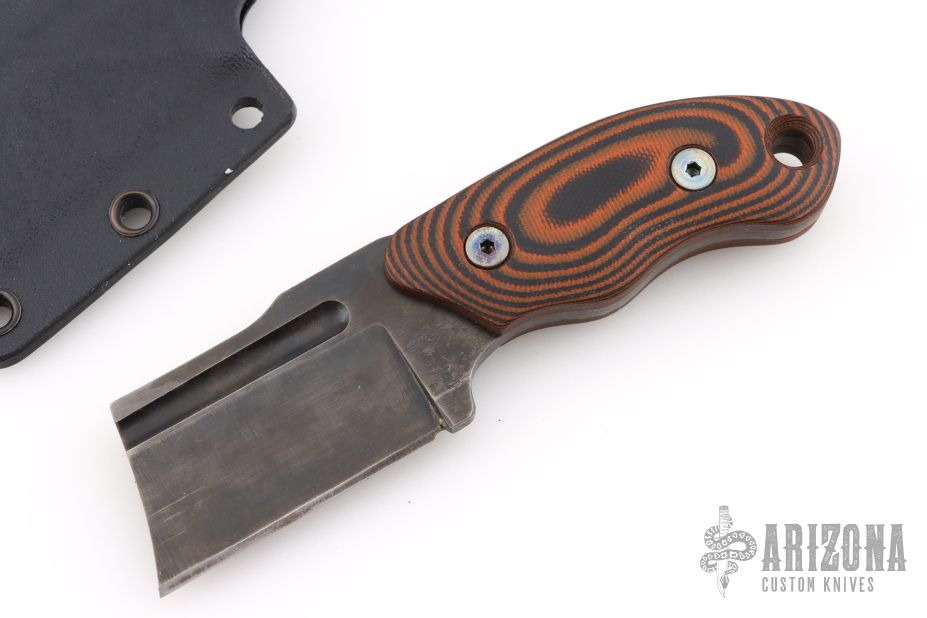 This Mini Cleaver by TK Knives (please let us know if you know who this is) features a black blade with fullers, .188" blade stock and 1.493" blade depth, full tang construction with black/orange G-10 scales. Comes with a kydex sheath. Has some sheath scuffs, otherwise excellent condition.