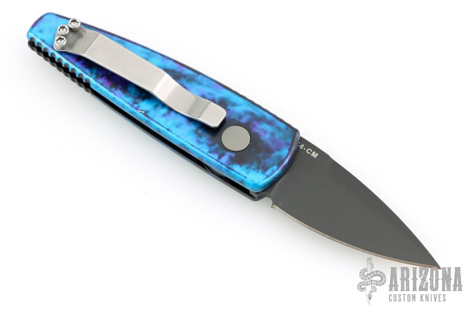 The California legal (blade is less than 2 inches) Pro-Tech Stinger features a precision ground spear point blade and milled ridges for extra grip in the spine and belly of the nicely contoured handle. The handle is hand satin finished prior to anodizing. Solid button release opening and closing plus compact, lightweight construction makes the Stinger a very nice automatic. Comes with original box and papers. Excellent condition.