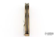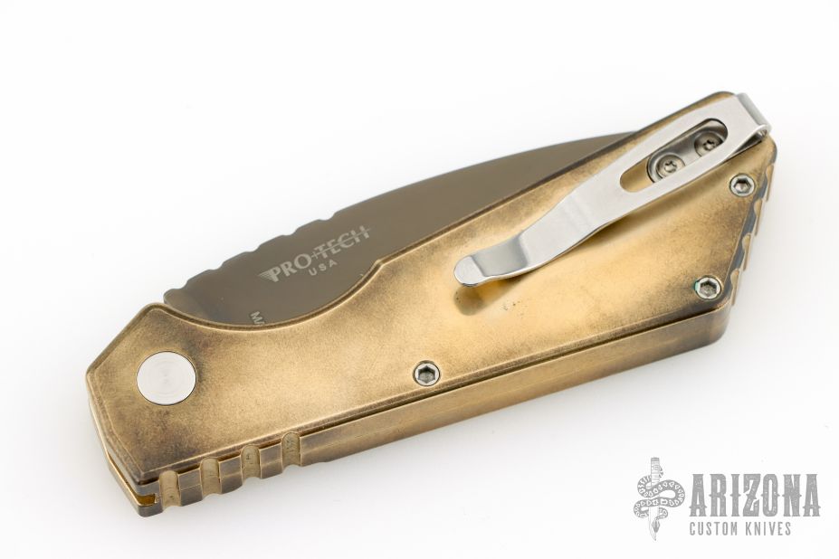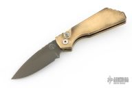 This PT+ Auto is a collaboration between Protech and Strider features a smoky gray coated drop point blade. The handle has an aluminum bronze frame with a stainless tip up clip. Pearl inlaid button. Comes with original box, pouch, and papers. Has some light scuffs and patina, excellent condition otherwise.