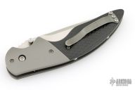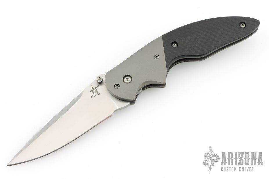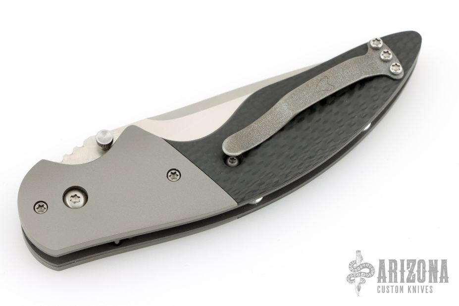This knife by Greg Lightfoot features a satin finished blade with notched thumbrest and dual thumb studs. The handle has titanium bolsters, carbon fiber scales, bead blasted titanium liners and tip up clip, with titanium standoffs. Has a few light scuffs, otherwise excellent condition.