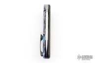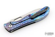 This Mini Notorious by Gerry McGinnis features a hand rub satin finished blade with thumbhole and notched thumbrest. The handle has a textured carbon fiber cover with vintage micarta inlay, timascus lock-side, Zirconium tip up clip, and anodized titanium backstrap. Nice detent, lockup and blade seating. Comes with zippered case. Dated 4-24-22 and #048 on the inside of the frame. Has a couple light scuffs and scratches, otherwise Excellent condition.