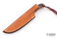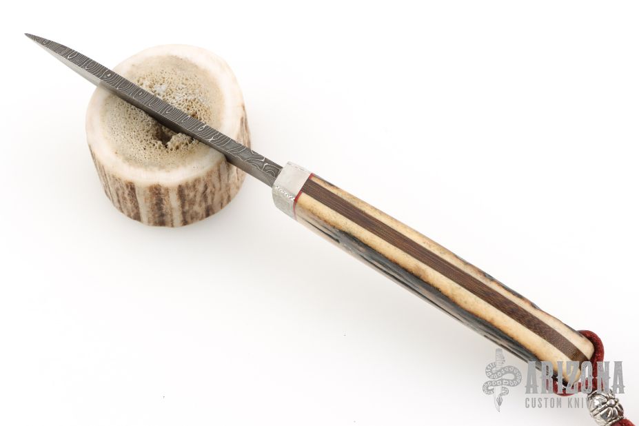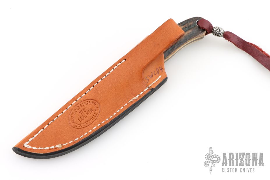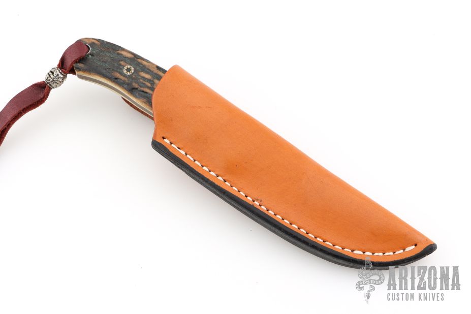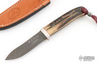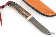 This Knife from Mr. Pease features a Doug Ponzio Damascus blade with .152" blade stock and .776" blade depth, hidden/frame tang construction. The handle has a textured stainless steel guard, antique stag scales with mosaic pins, red spacer and a black linen micarta frame. Comes in custom leather sheath by TFC Leather. Excellent condition.