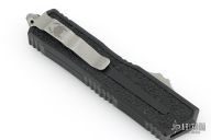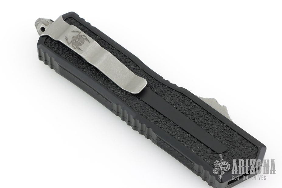 This Scarab II Gen III by Microtech features an apocalyptic finished blade with fullers. The handle has a black aluminum handle with non-slip inserts, a single glass breaker and tip down stainless steel clip. Comes with original box and papers. Has a few light scuffs, excellent condition.