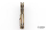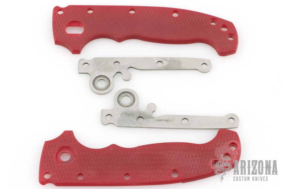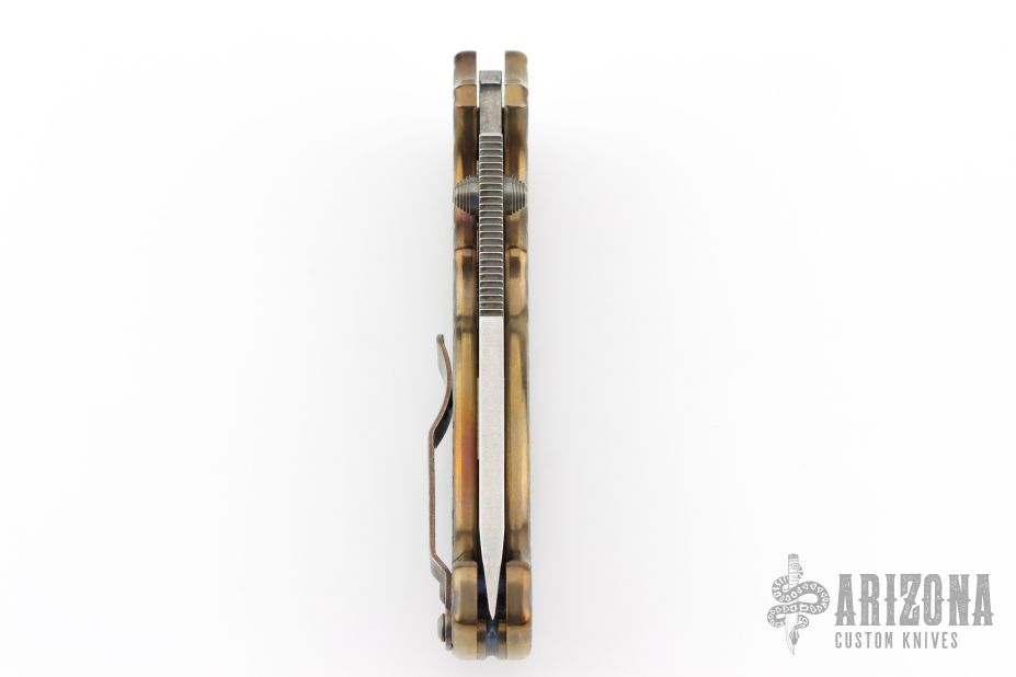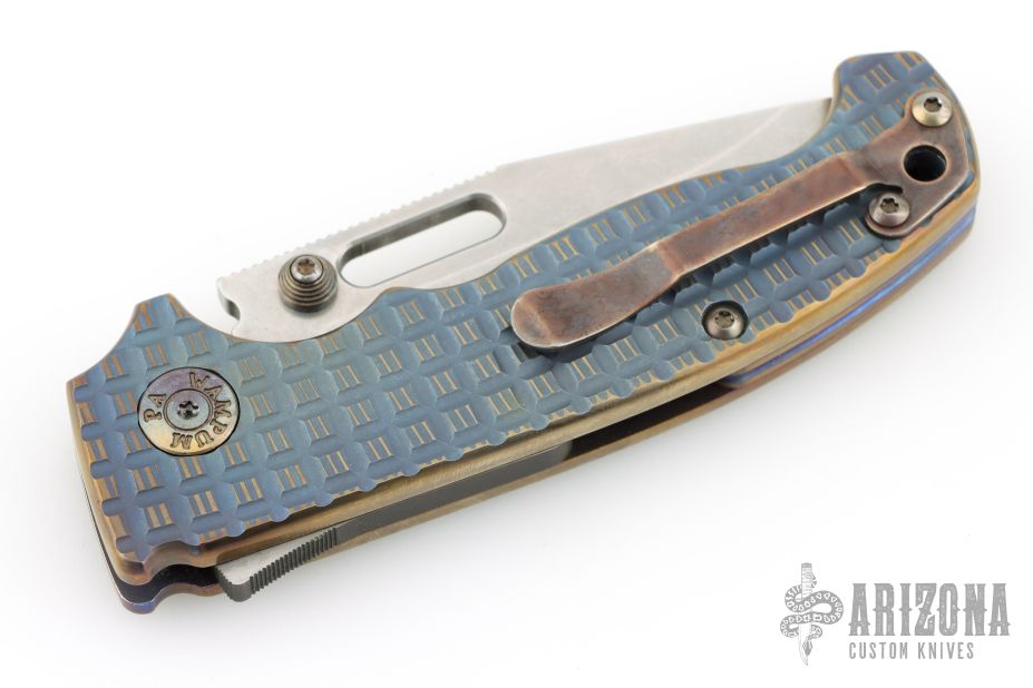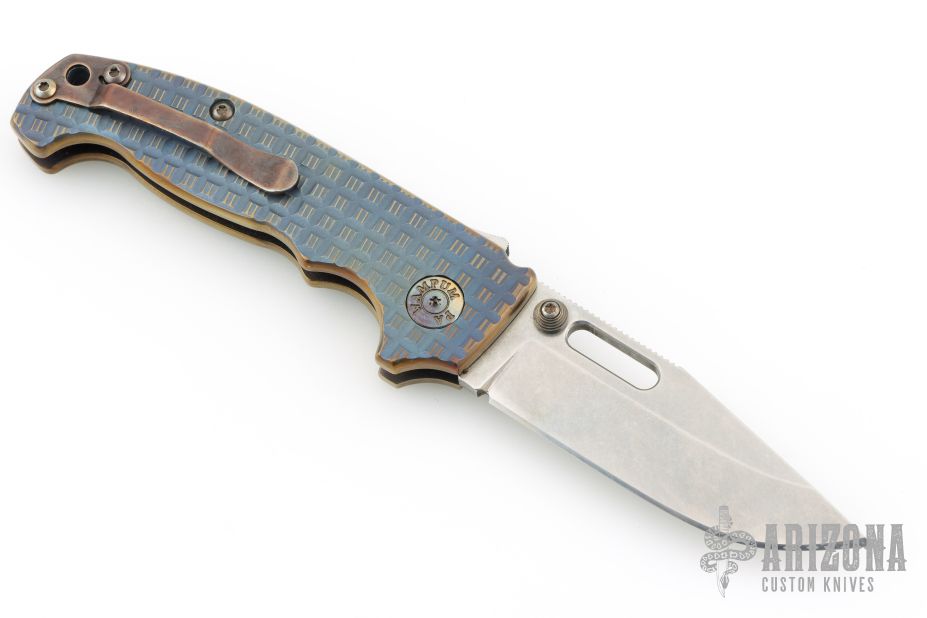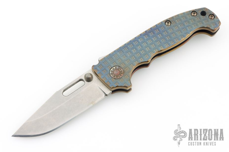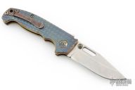 This MG AD20 by Andrew Demko features a tumbled finished blade with notched thumbrest, thumbhole and dual thumbstuds. The handle has a milled and anodized titanium frame, and backspacer, with a tip up stainless steel clip and "shark" lock release on the spine. Heat anodized hardware and Skiff bearings installed. Comes with original red g10 covers, bearings, standoffs, and liner. Has some light scuffs and scratches, great overall condition. Appears to have been resharpened.