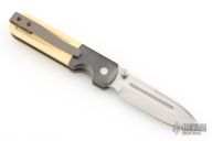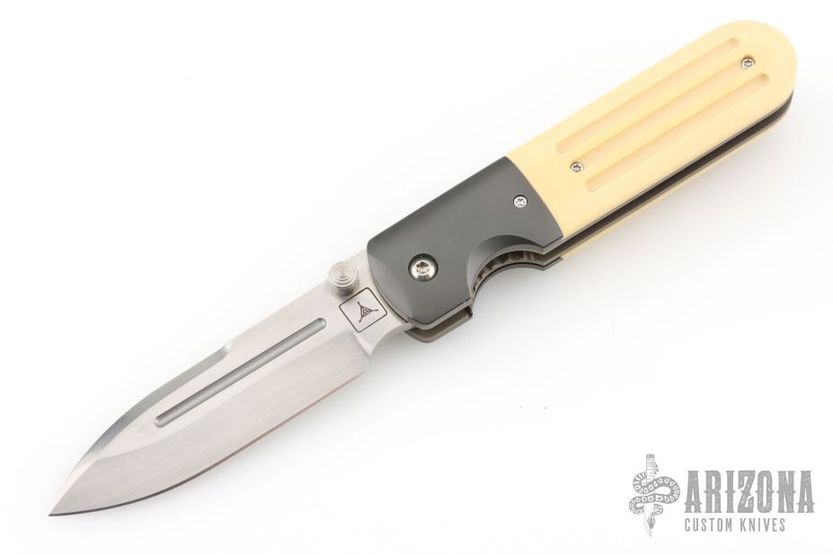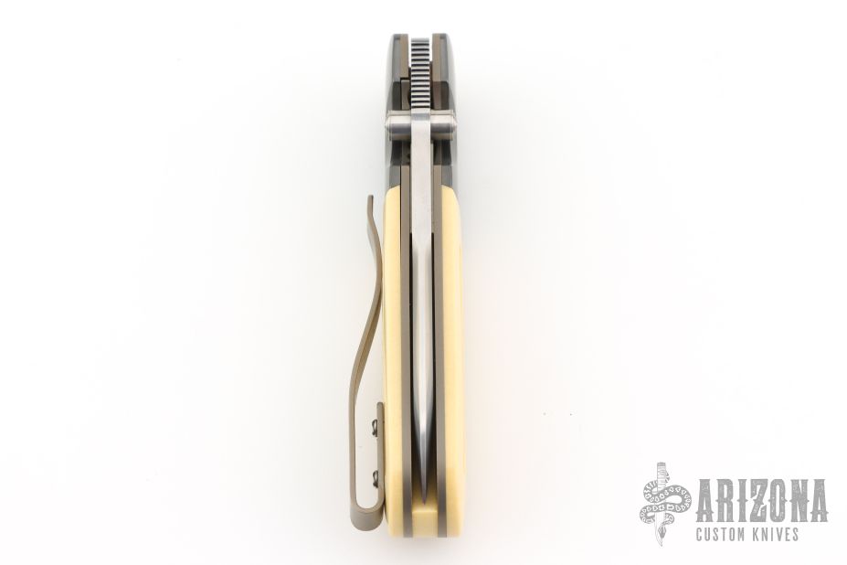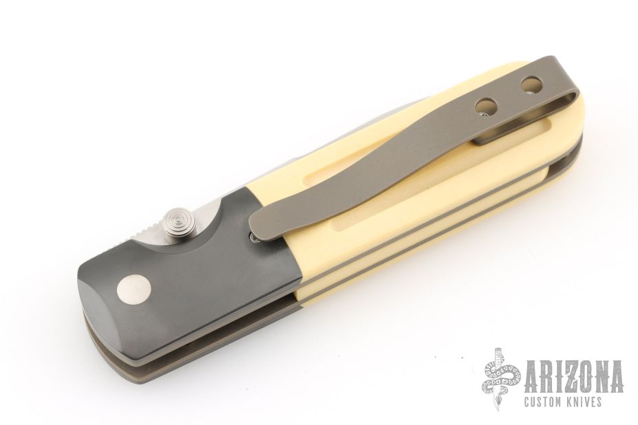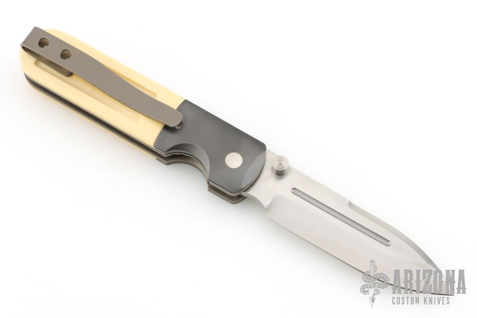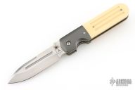 This Capricorn 66 by John W. Smith features a hand rub satin finished blade with dual thumb studs and nothced thumbrest and fullers. The handle has zirconium dovetailed bolsters, Westinghouse ivory paper micarta scales and backspacer, bead blasted titanium liners and tip up clip. Beautiful work and great function. Strong lock up, nice detent and blade seating is center. Excellent condition. Comes with original box.