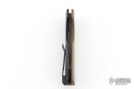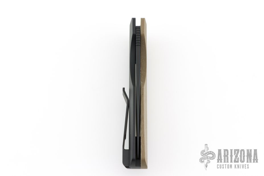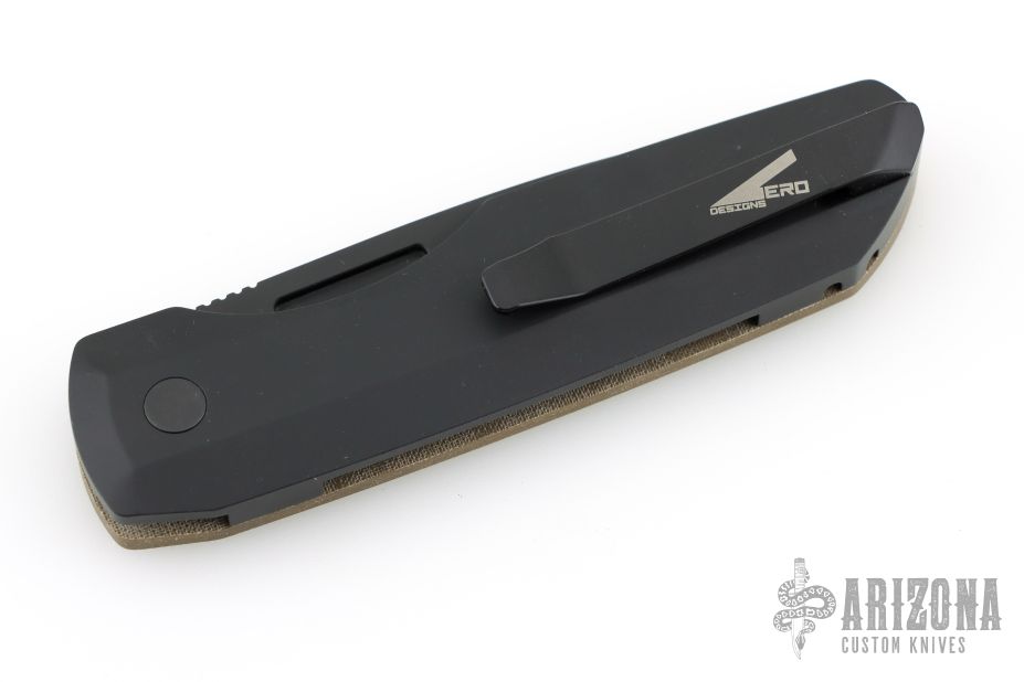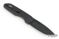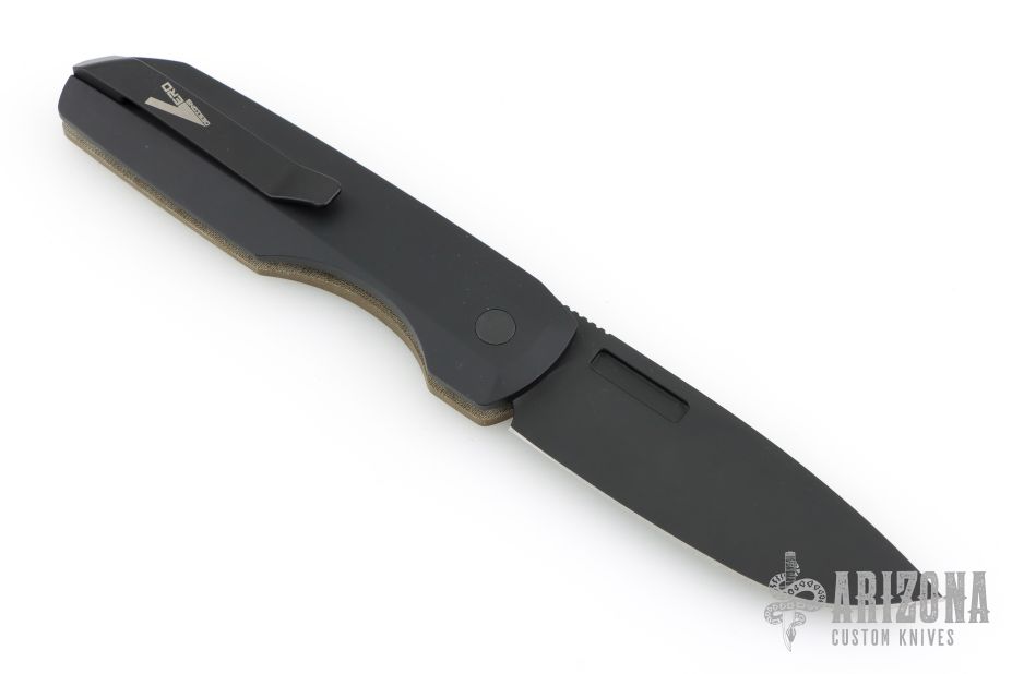 This Synapse LTD by Pro-Tech is a Vero Engineering design. It has a black finished blade with notched thumbrest. The handle has a green linen micarta and black aluminum frame, black push button, tip up black titanium clip with hidden screws. Comes with original box, pouch and papers. Excellent condition.