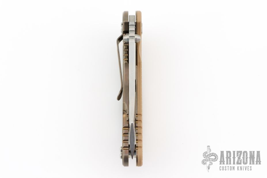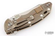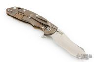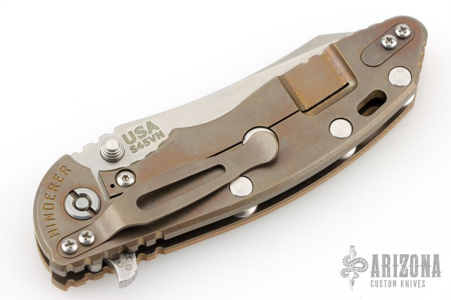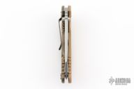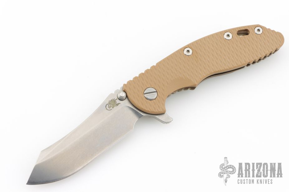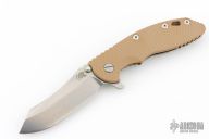 This XM-18 skinner by Rick Hinderer Knives features a 3.5" stonewash finished blade, notched thumbrest and dual thumbstuds. The handle has a tan G-10 scale, and a stonewashed titanium handle/clip. Clip can be mounted for tip up or down carry. Tri-way pivot system. Nice lockup, and detent. Includes the original box, extra washers, and card. Excellent condition.
