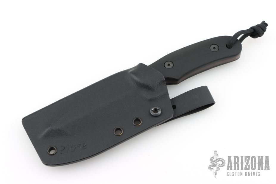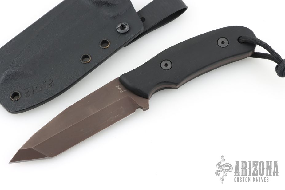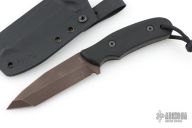 This RM by Duane Dwyer features a MilSpec Black Oxide tanto blade with .180" blade stock and 1.210" blade depth, full tang construction with contoured g10 scales and lanyard hole at the butt. Comes with a kydex sheath with belt loop. Has some scuffs and scratches, great condition otherwise.