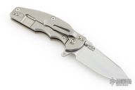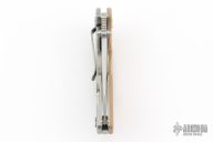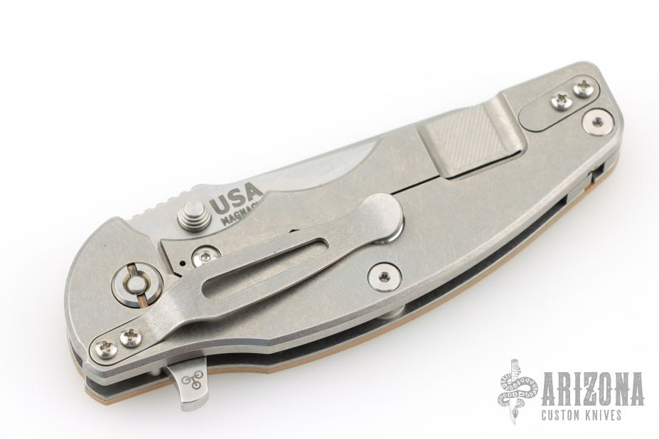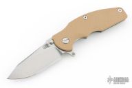 This Jurassic by Hinderer Knives features a stonewashed, hollow ground, drop point blade with notched thumbrest and flipper. The handle has a stonewashed titanium frame with a brown G-10 scale, tip up or down reversible clip and a modular backspacer. Nice detent, lockup and blade seating. This knife has the Tri-Way pivot system. Comes with original box and extra washers. Excellent condition.