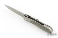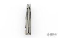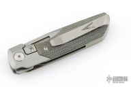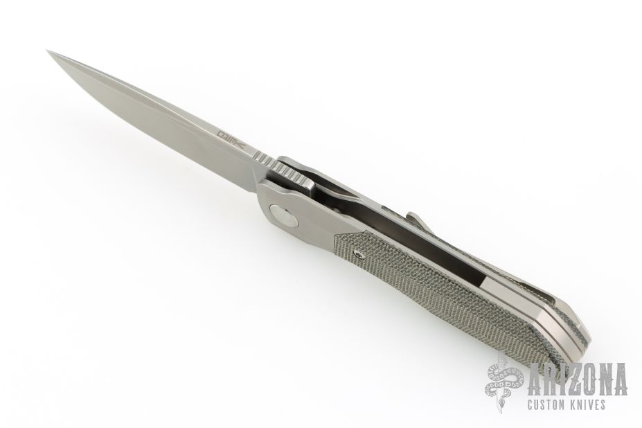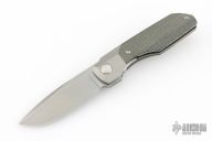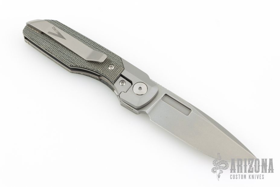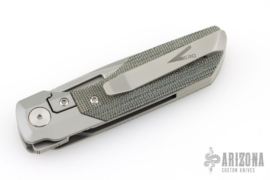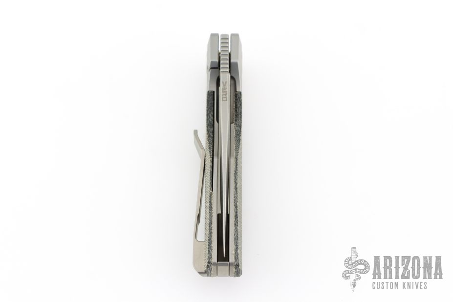 This Synapse Folder by Vero Engineering features a stonewash finished blade with notched thumbrest and flipper. The handle has a tumbled and bead blast finished titanium frame with micarta scales, tip up clip with hidden screws and backspacer. Rides on bearings, nice detent, lockup and blade seating. Comes with original box and zipper case #1981. Excellent condition.
