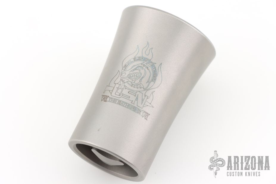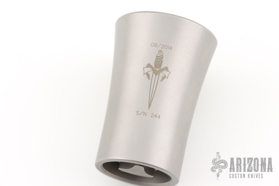 Stainless steel shot glass with Marfione Dagger Logo and #244. Dated 08/2014. Excellent condition.