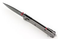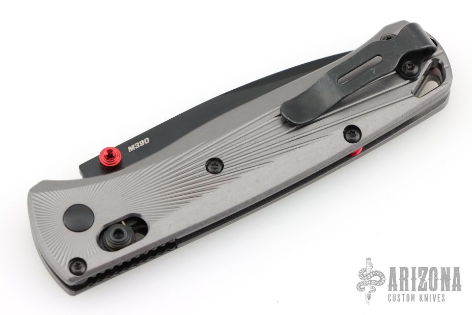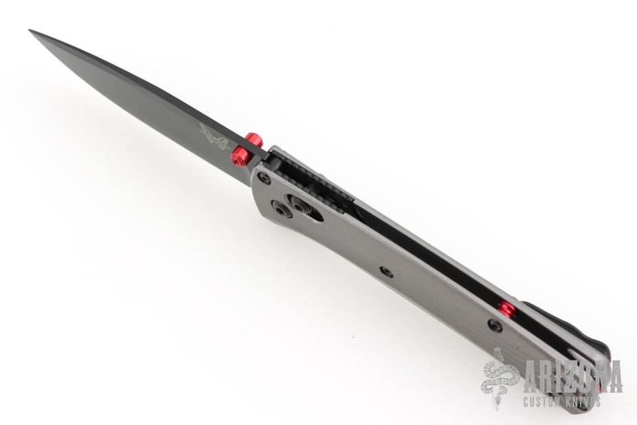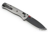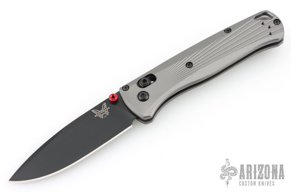 The Bugout features a drop point blade with a flat dark Cerakote finish. It's a manual opener with ambidextrous thumb studs. This AXIS lock has a milled aluminum frame and black hardware, a black mini deep-carry pocket clip, and a lanyard hole. Includes original box, pouch and papers. Excellent Condition.