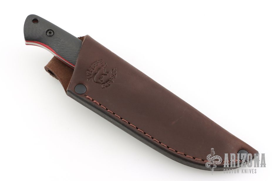 Jason’s classic Utility Hunter is made to his specifications and features an ergonomic handle paired with a multi-purpose blade shape, top tier materials, and White River’s fit and finish. Has carbon fiber scales with red G-10 liners. Includes a leather sheath
