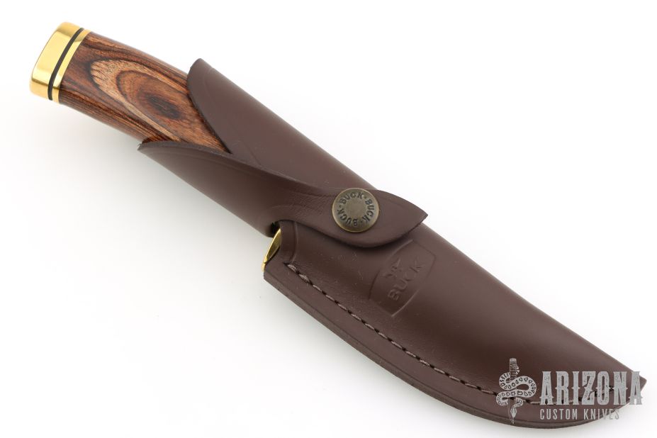 The Vanguard is a classic fixed blade featuring a Heritage Walnut Dymondwood handle with a brass guard and pommel. It's designed for for big game hunters, but with its versatile drop point blade you'll find it an excellent general utility field knife as well. The blade is Buck's standard 420HC steel, Bos heat treated to a Rockwell hardness of 58 RC. Buck's Vanguard is supplied with a leather sheath.