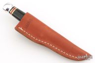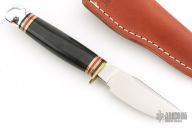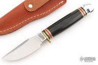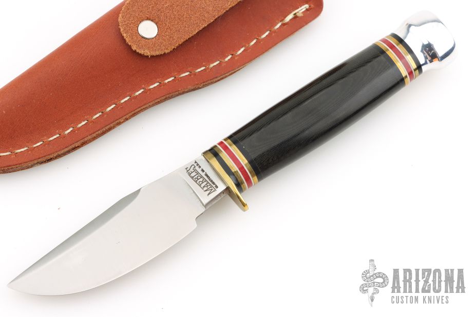 This Trailcraft by Marbles features a satin finished blade with false top edge, .212" blade stock and 1.068" blade depth, hidden tang construction. The handle has a brass guard, aluminum butt, black linen micarta grip with black/brass/white/red spacers. Comes with original box and sheath. Excellent condition.
