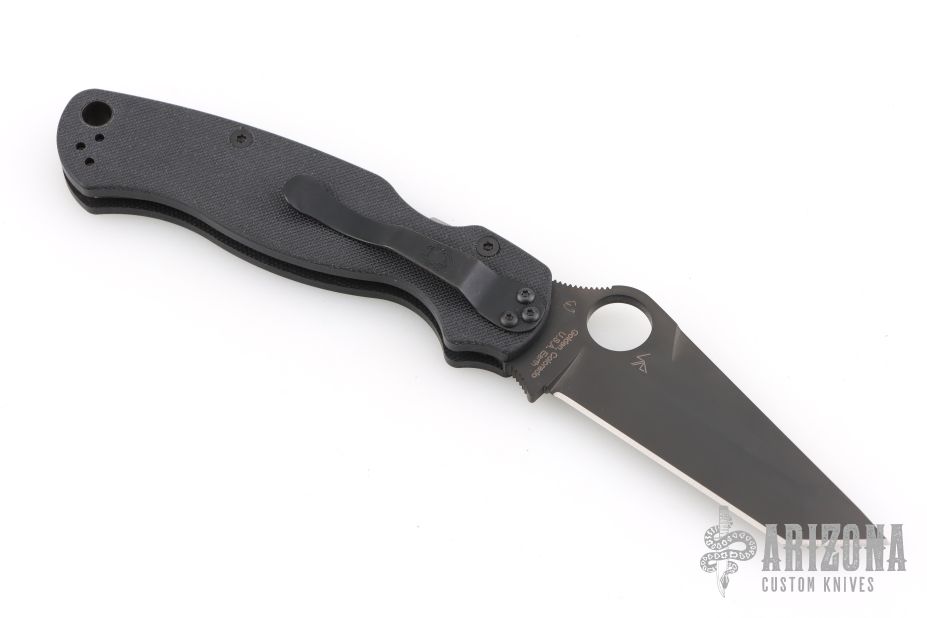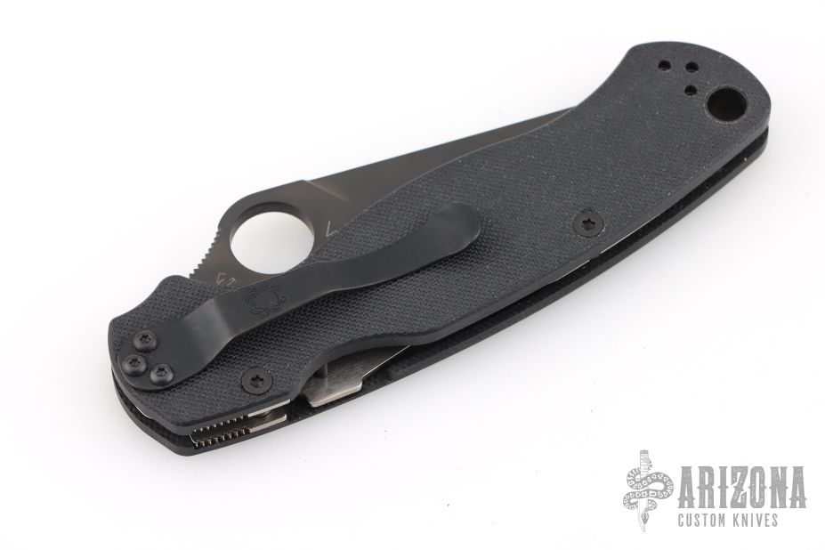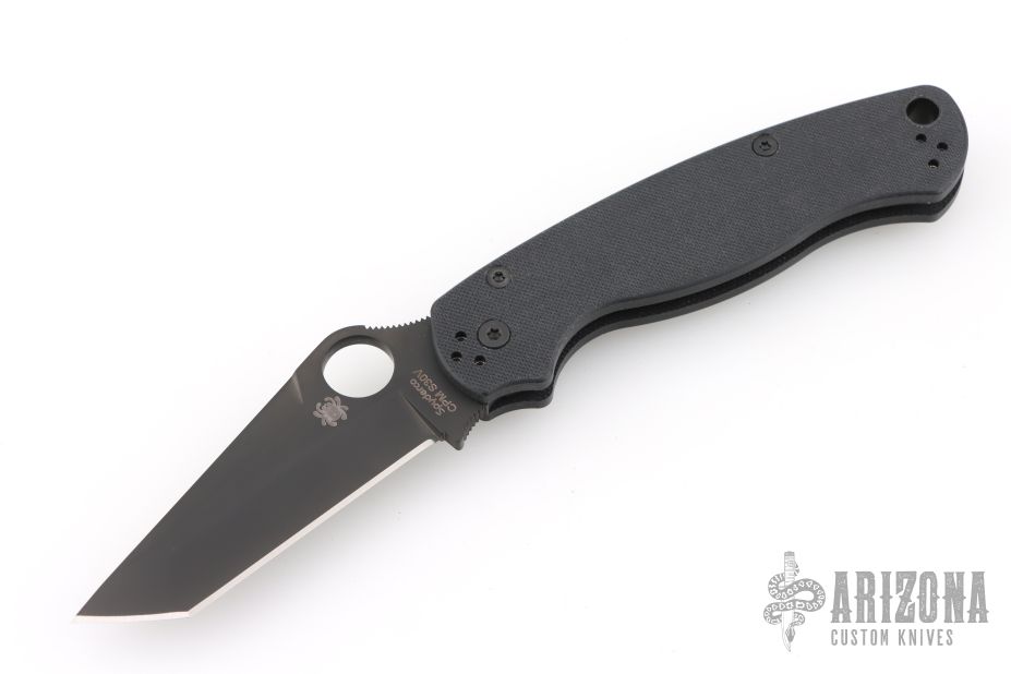 This G81GM4BKP2 Paramilitary 2 by Spyderco features a black tanto blade with thumb hole, notched thumb ramp and choil. The handle has textured black G10 scales over a stainless steel subframe and lockbar. 4 way adjustable pocket clip and lanyard tube in pommel. Includes original box and paperwork. Excellent condition.