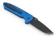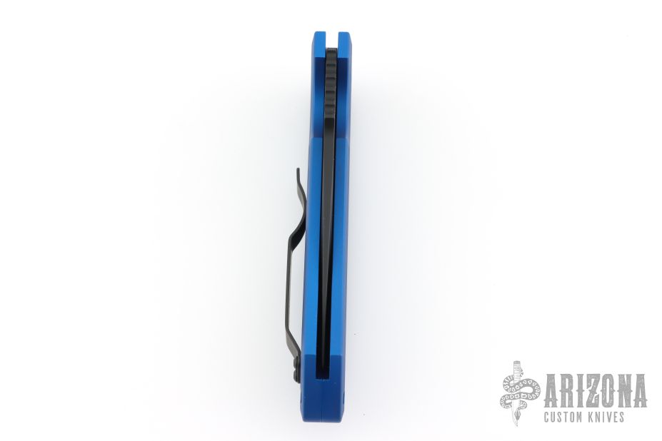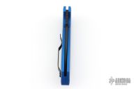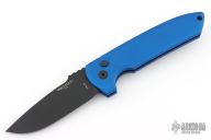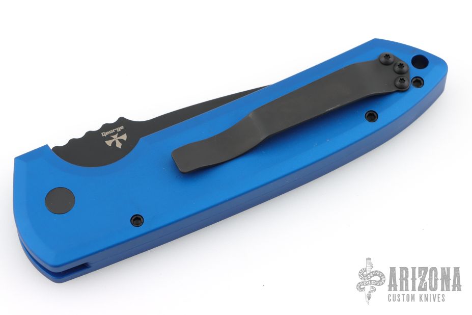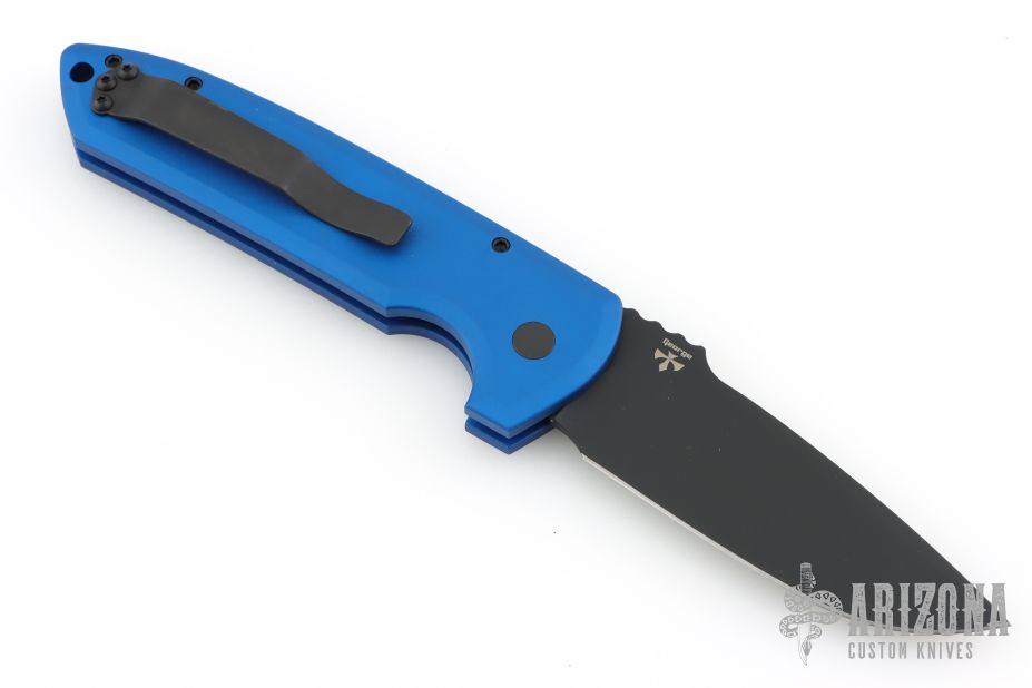 This Pro-Tech Rockeye has a black blade with notched thumbrest. The handle has a blue aluminum frame with a black steel tip up pocket clip and black push button. Typical flawless Pro-tech mechanics and blade seating. Comes with original box, pouch, and papers. Excellent condition.