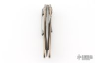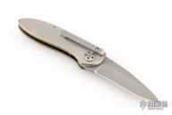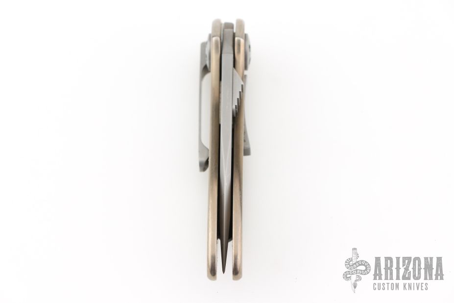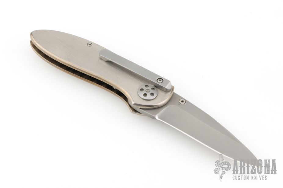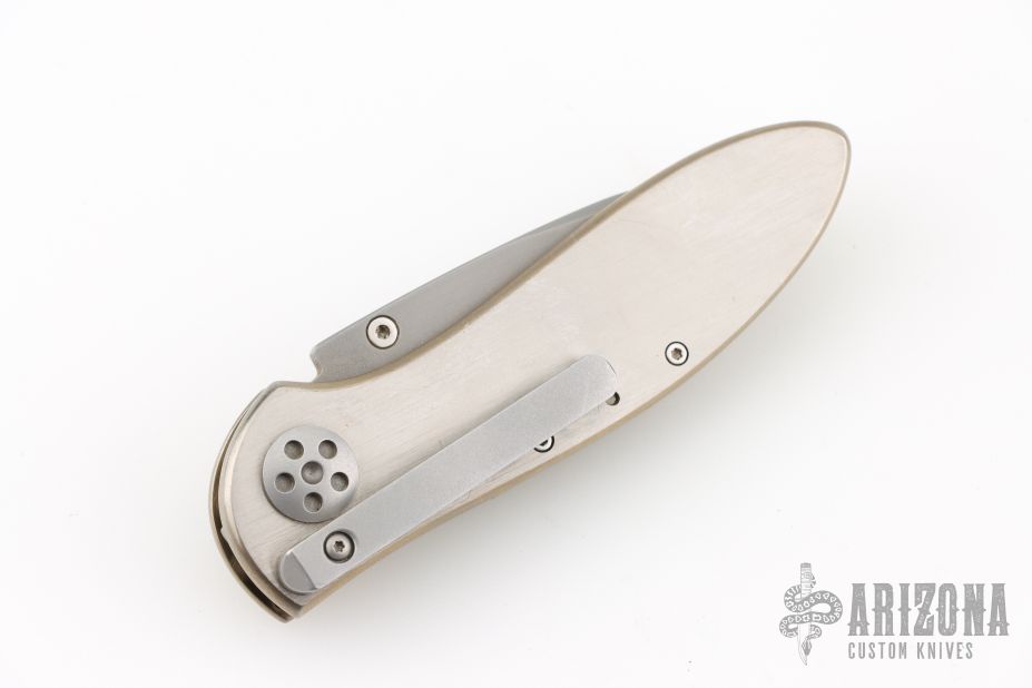 This California Opening Folder from Allen Elishewitz features a bead blasted blade with single stepped thumbstud. The handle has a satin finished titanium frame over a black G-10 backspacer. Stainless steel tip down pocket clip. Nice lockup and blade seating. Comes with a black nylon belt sheath. Has some light scratches, otherwise good condition.