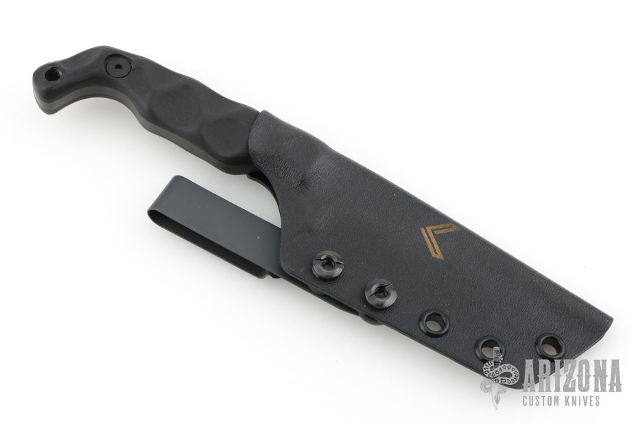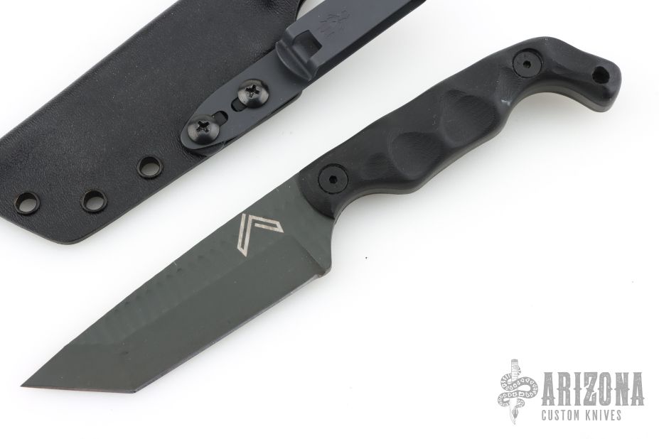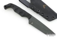 This B5 by Stroup Knives features a dark tumbled tanto blade with sculpted flats and a full tang construction.  .163" Blade Stock.  1.13" Blade Depth.  The handle features sculpted G10 scales.  Includes a kydex sheath with a Tek-Lok.  Includes the original box and blue trainer knife. Excellent condition.