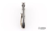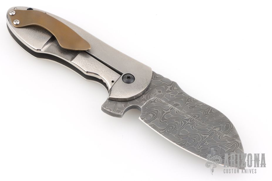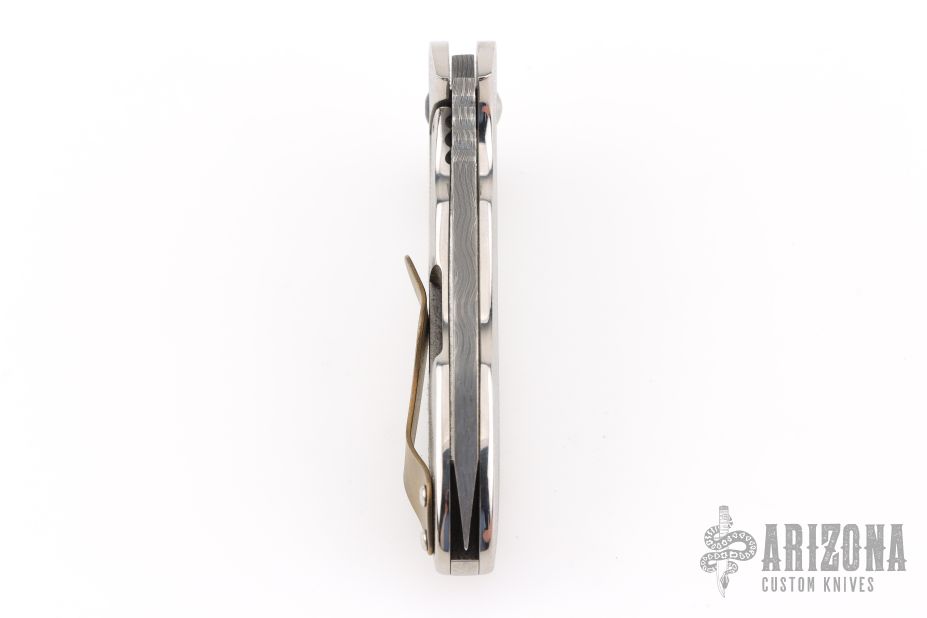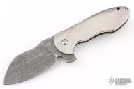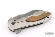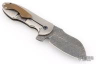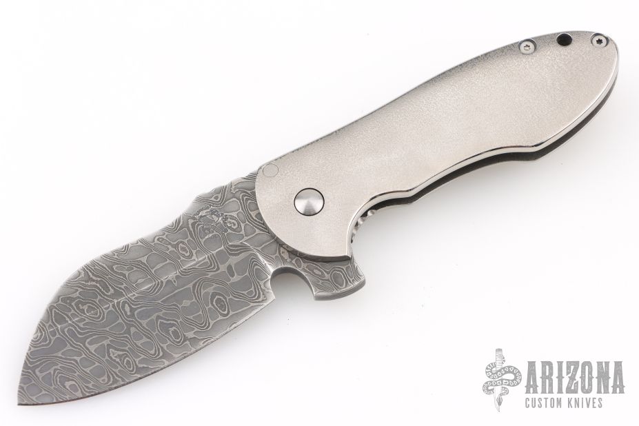 This framelock flipper by Michael Burch and Tom Krein features a stainless Damascus blade with a notched thumbrest and flipper. The handle has an orange peel finished titanium frame with polished edges, orange peel finished titanium backspacer, and a tip up anodized and orange peel finished titanium clip. Very smooth flipper that opens effortlessly with no wrist action. Almost perfect blade seating, and perfect detent, and lockup. Excellent work. Includes a zippered case. Marked Krein 2012 on one side of blade and Burchtree Bladeworks on the other. Excellent condition. Stamped "5" inside handle.