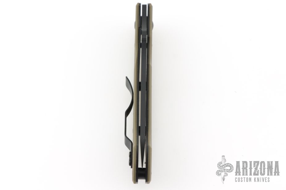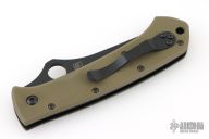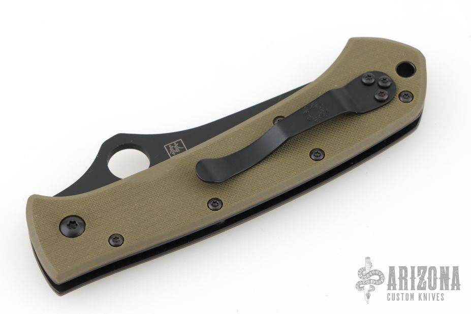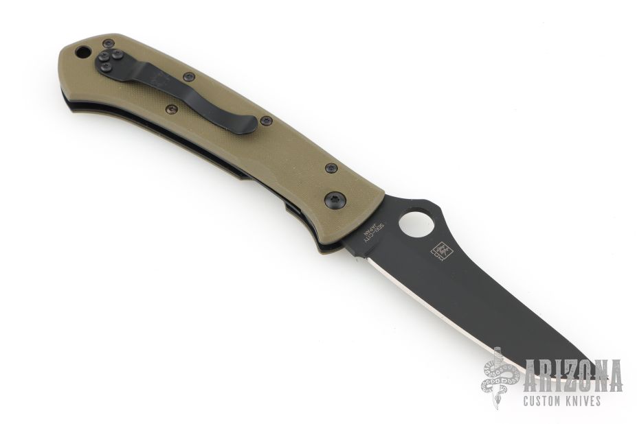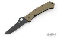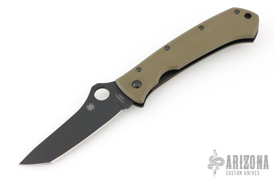 This Bob Lum designed folding knife by Spyderco features a black tanto style blade marked with the Lum Logo. Stainless steel liners. Textured green G-10 scales, tip up stainless steel clip. Comes with original box and papers. Nice detent, lockup and blade seating. Has a couple light scuffs, excellent condition.