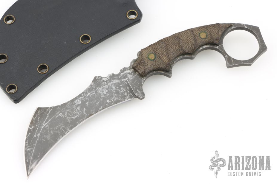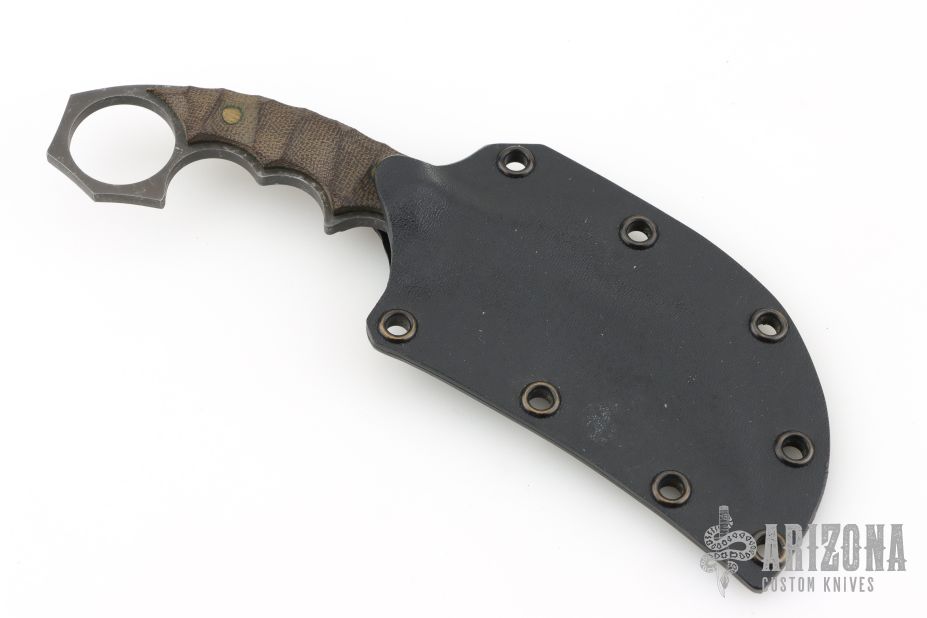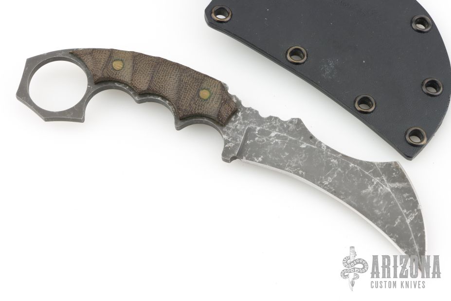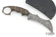 This Karmabit by HavocWorks features a dark tumbled hawkbill blade with a sharpened top edge, notched thumbrest and a full tang construction.  .173" Blade Stock.  1.184" Blade Depth.  The handle has green canvas micarta scales and a ring at the butt.  Includes a kydex sheath.  Excellent Condition.