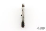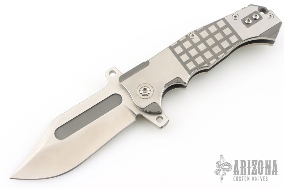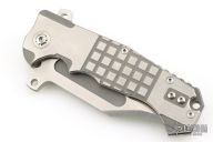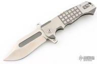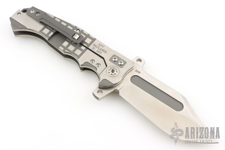 This ADV Badlands framelock flipper has a satin finished blade with swedge, fullers, notched thumbrest and flipper. Handle has a two-tone titanium frame, titanium backspacer and tip up clip with roller, satin hardware. Rides on bearings, nice smooth action, detent, lockup and blade seating. Comes with nylon zippered case. Excellent condition.