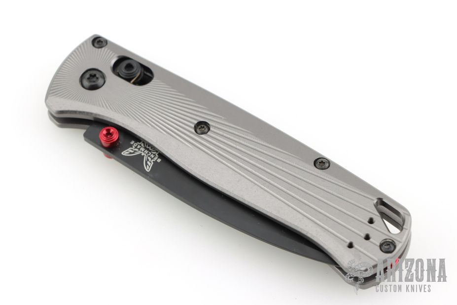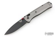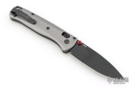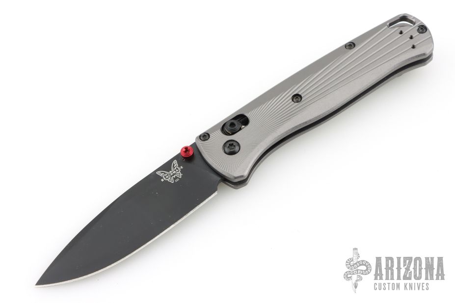 The Bugout features a drop point blade with a flat dark Cerakote finish. It's a manual opener with ambidextrous thumb studs. This AXIS lock has a milled aluminum frame and black hardware, a black mini deep-carry pocket clip, and a lanyard hole. Includes original box and papers. The box is deluxe. Has marks on the clip, otherwise Excellent condition.