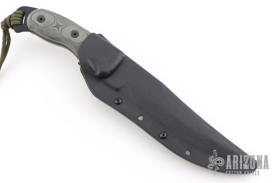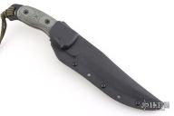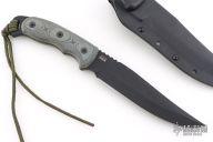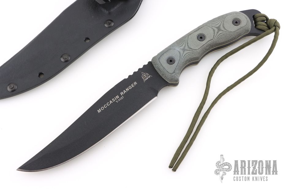 The TOPS Knives Moccasin Ranger knife was named in honor of the famed Cherokee Moccasin Rangers of World War II. This is a tough knife with a 1/4 inch thick full tang black finished 1095 high carbon steel blade. The black linen Micarta scales are contoured for an ideal fit. The aggressive notching up top combines with the index choil below to facilitate precision cuts. The tang extends over 1/2 inch past the scales for use with lanyard. Comes with original Kydex sheath. Excellent condition.