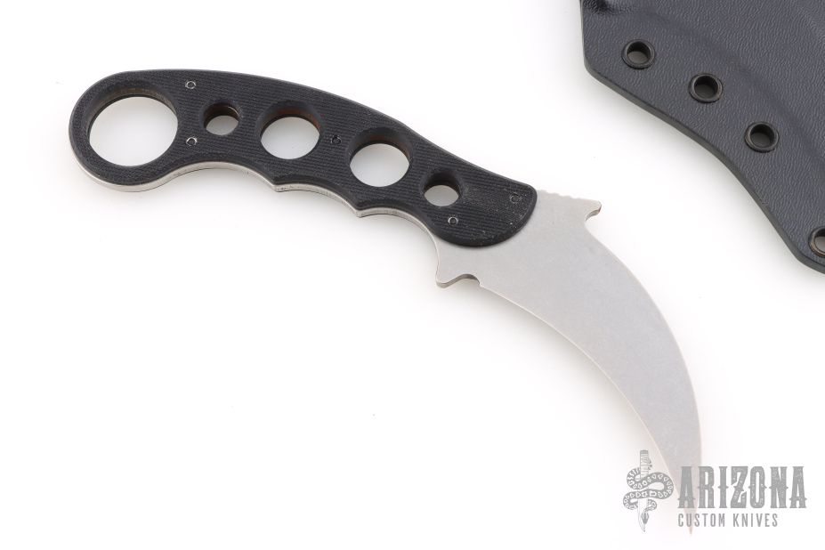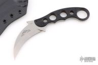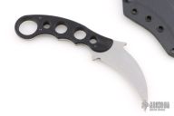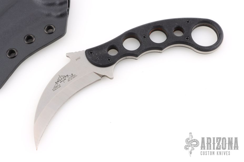 This karambit by Emerson Knives features black G-10 scales. Stonewashed chisel ground blade. Includes a black kydex sheath. Excellent condition. #0702 on blade.