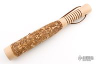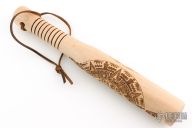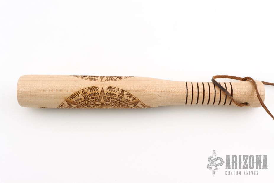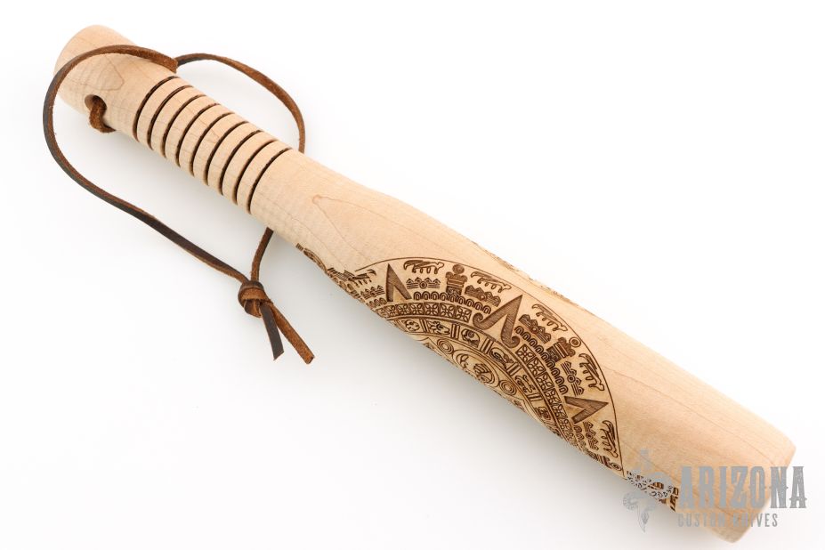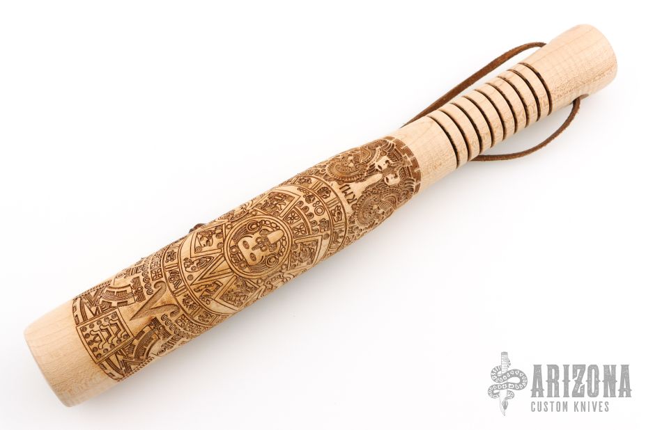 Straight from Ryan's personal shop, the Gold Point Barkeep stick is perfect for all your small format bashin' and general ass whoopin' needs! Ryan built these sticks at the Gold Point Forge on his Defiance 1904 lathe. These Barkeeps can be easily tucked in a bag or thrown in your gear. Each is solid chunk of hard rock maple, that has been tapered down to the handle (featuring the signature texture that the Defiance lathe is known for). A lanyard hole is placed just below the handle to keep your hand locked in. On top of that, each Billy is loaded with a lead weight at the tip for some extra 'oomph'. The weight is capped and features RMJ Tactical's logo. These sticks feature a Mayan Calendar motif on the body, and each one features a natural finish. Excellent condition.