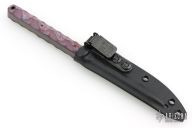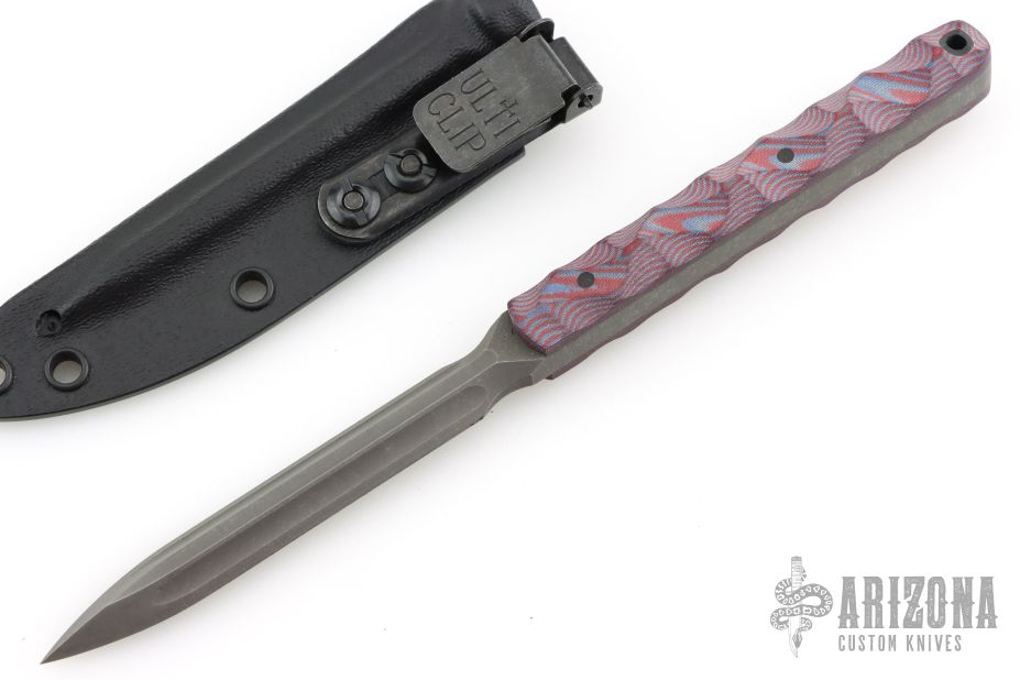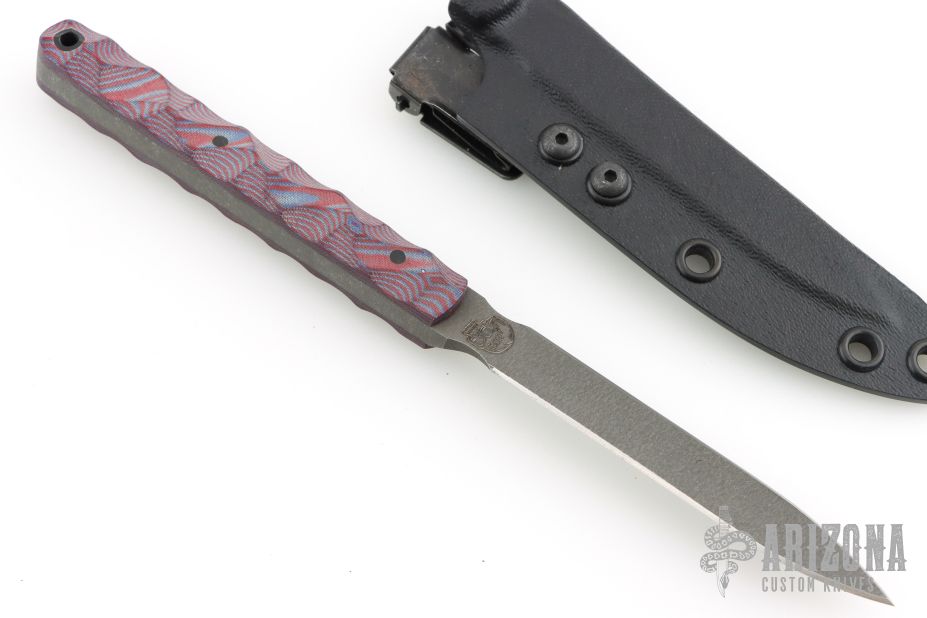 This Spike by Half Face blades. Has a chisel ground distressed blade with sculpted red/blue G-10 scales. .225" blade stock, .56" blade depth. Comes with kydex sheath with ulti-clip. Excellent Condition.