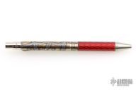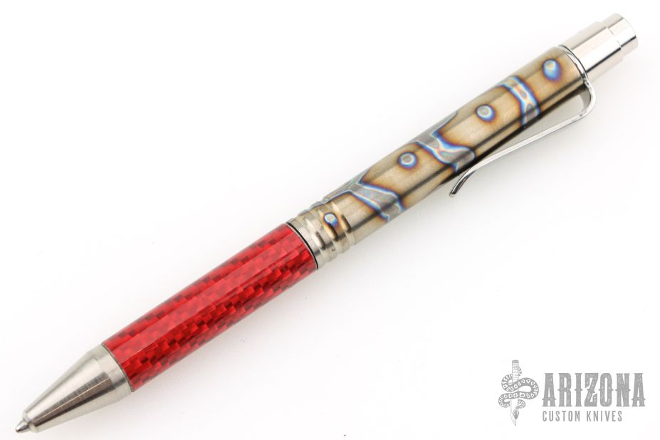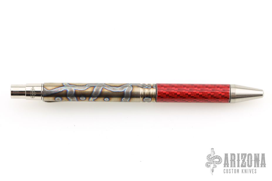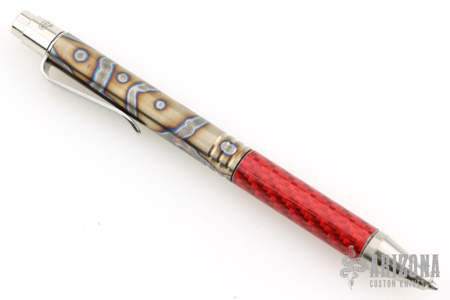5.13″ overall. Pocket clip. Click open. Black ink cartridge. Flamed Titanium body and CF grip.