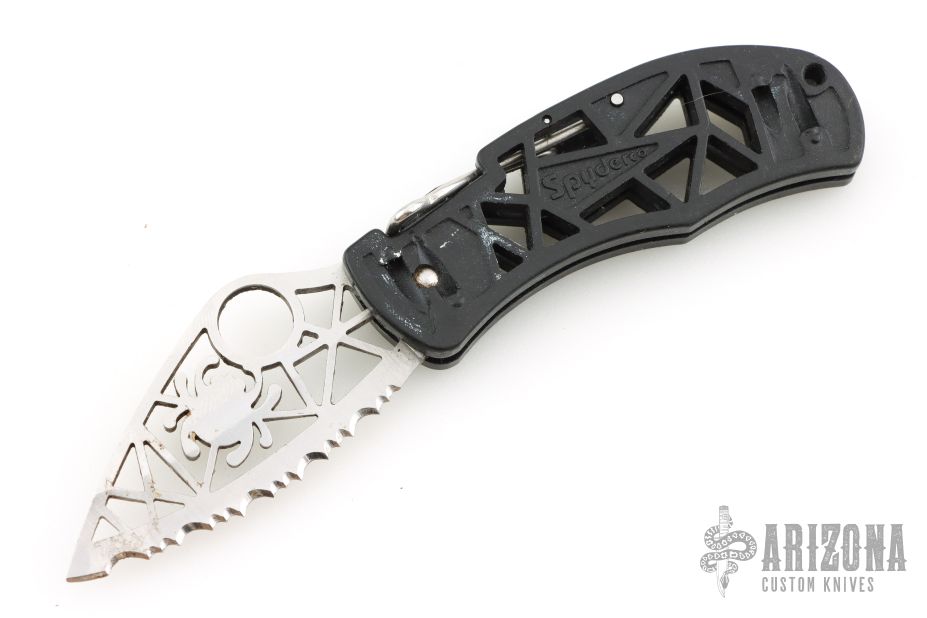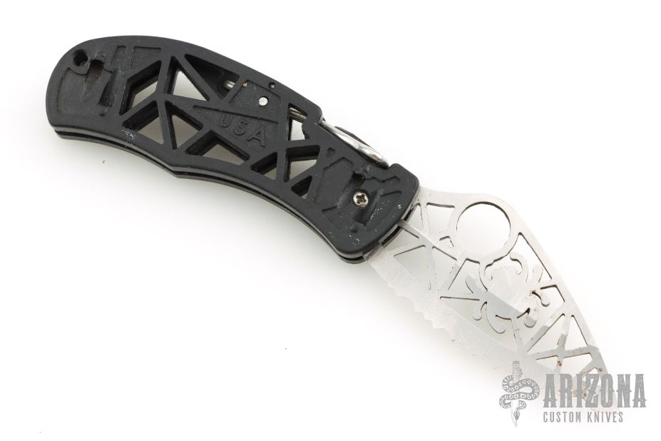 This Q Knife front-lock folder by Spyderco has a skeletonized satin finished stainless steel fully serrated blade with unique, clip-style front lock. Handle is black skeletonized polymer with 4-way reversible clip and lanyard hole. Has some scuffs and scratches, has some minor oxidation, otherwise fair condition..