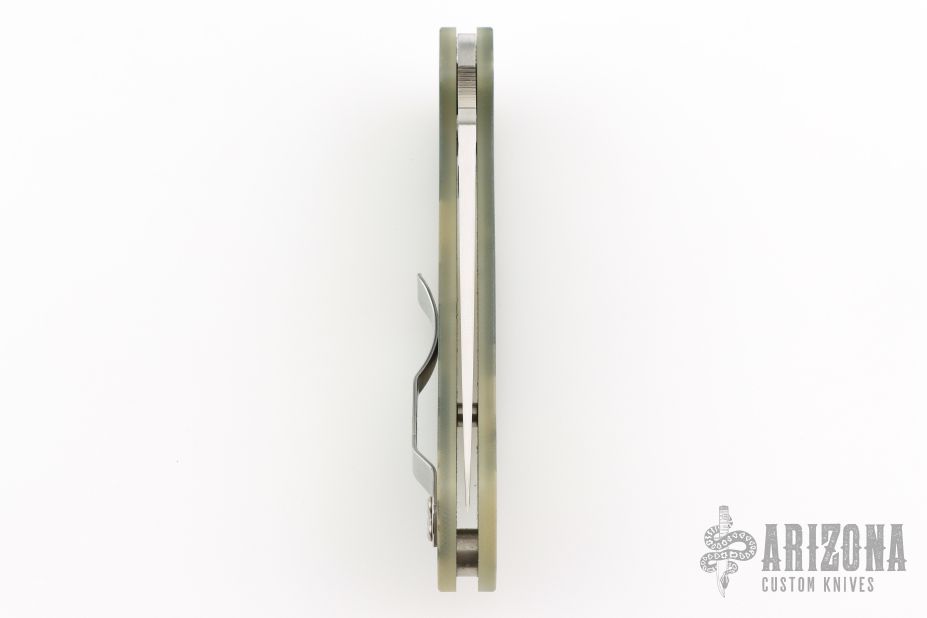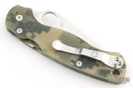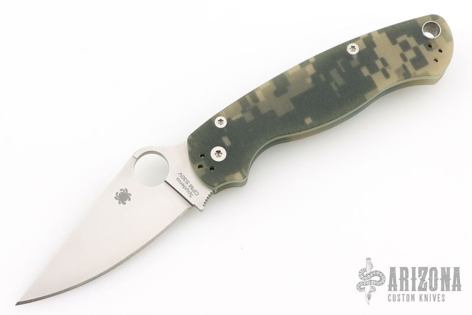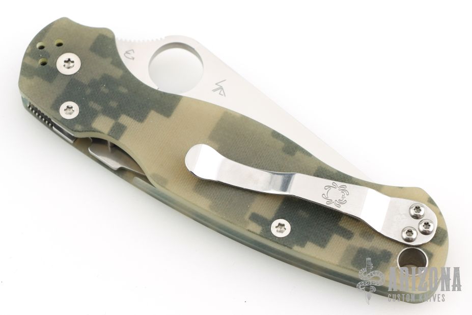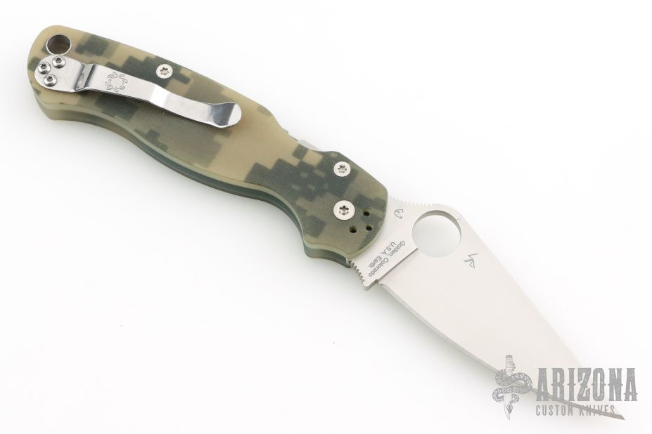 This Paramilitary 2 Linerlock Folder has a satin clip point blade with thumb hole and notched thumb rest. Handle is digi camo G10 with stainless steel liners and stainless steel 4-way reversible clip. Has a couple light scuffs, excellent condition.