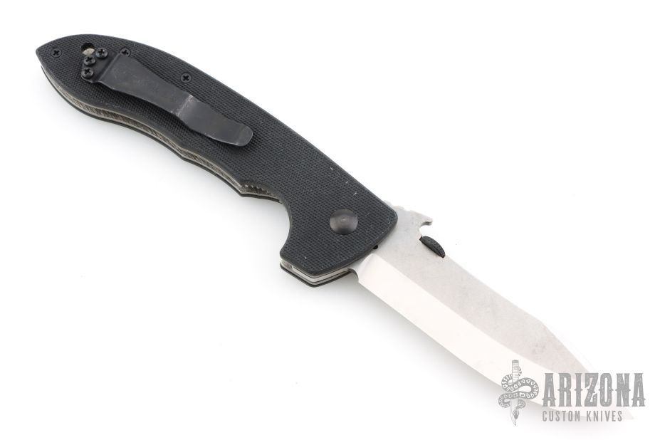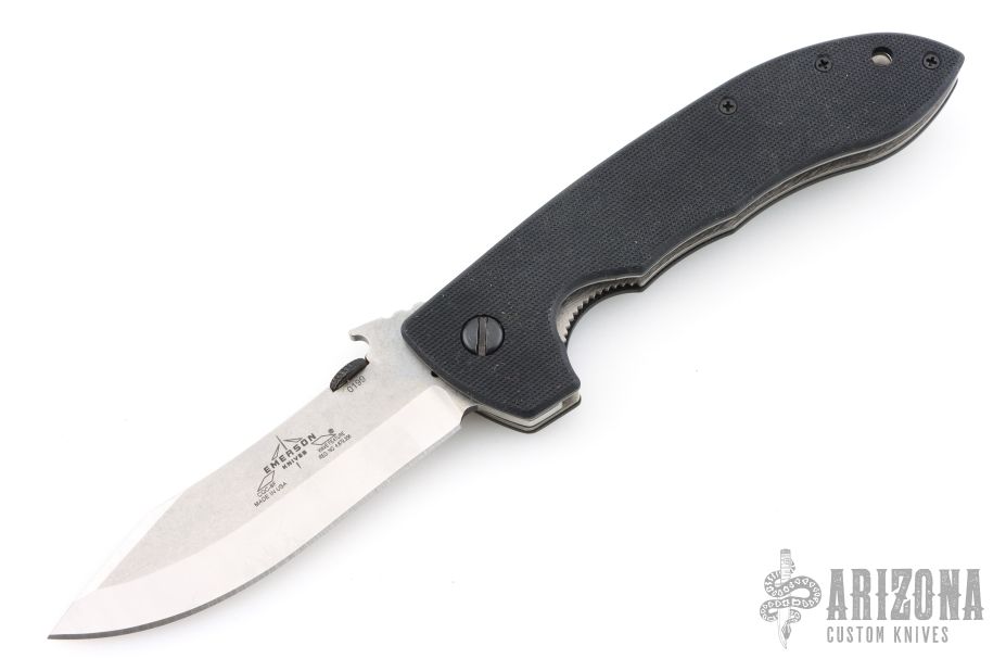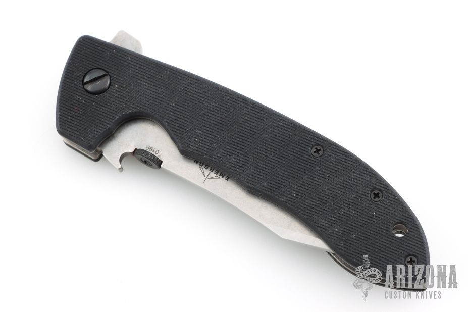 This CQC-8 Flipper by Emerson Knives features a satin/stonewashed plain edged blade with thumb disc and wave feature. Black G-10 scales over titanium liners. Has tip up SS clip. Has some light spots on the blade, otherwise excellent condition. #0199.