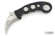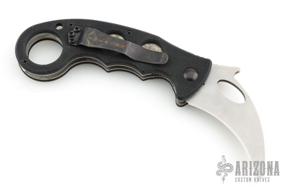 This Emerson Karambit has a stonewashed chisel grind blade with notched thumbrest, thumbhole and wave feature. Handle is black G10 with titanium liners, and black tip up black stainless steel clip, left or right reversible. S/N 5253. Excellent condition.