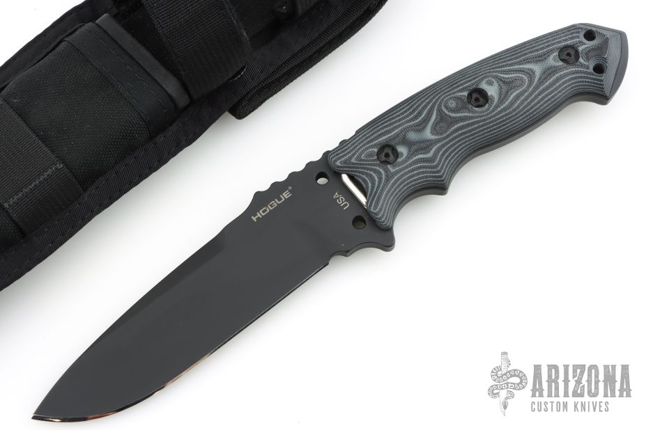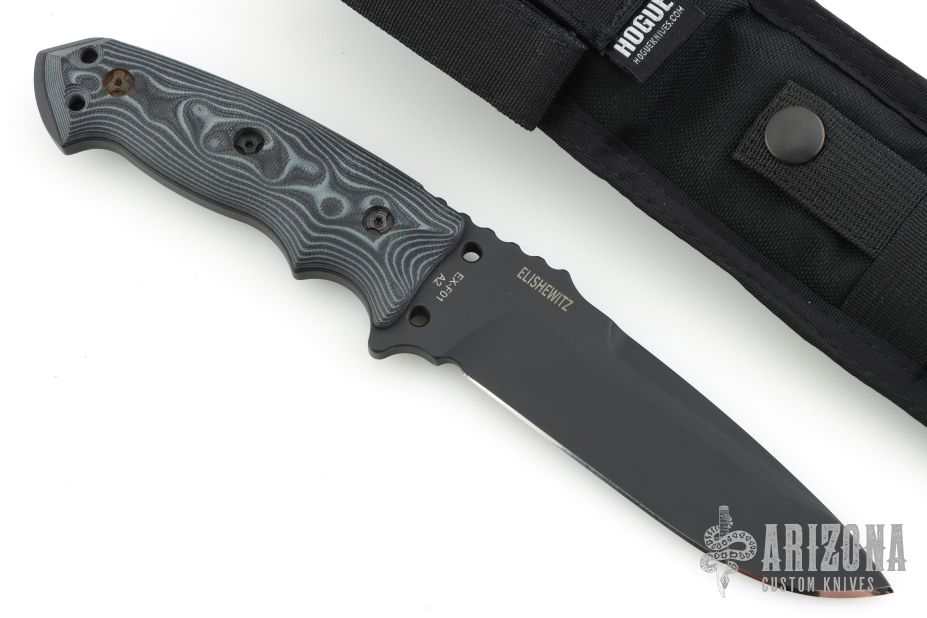 This Hogue EX-F01 fixed blade is an Allen Elishewitz design, it features a black coated drop point blade with swedge and notched thumb rest, .238" blade stock and 1.552" blade depth. The handle is comprised G-10 scales over full tang construction with exposed tang glass breaker pommel. Includes nylon sheath. Excellent condition.