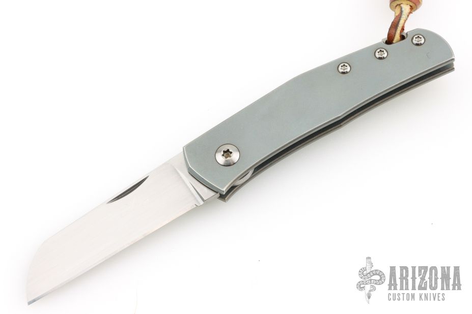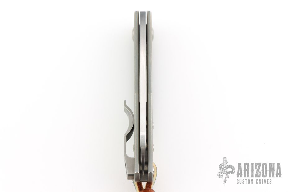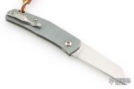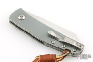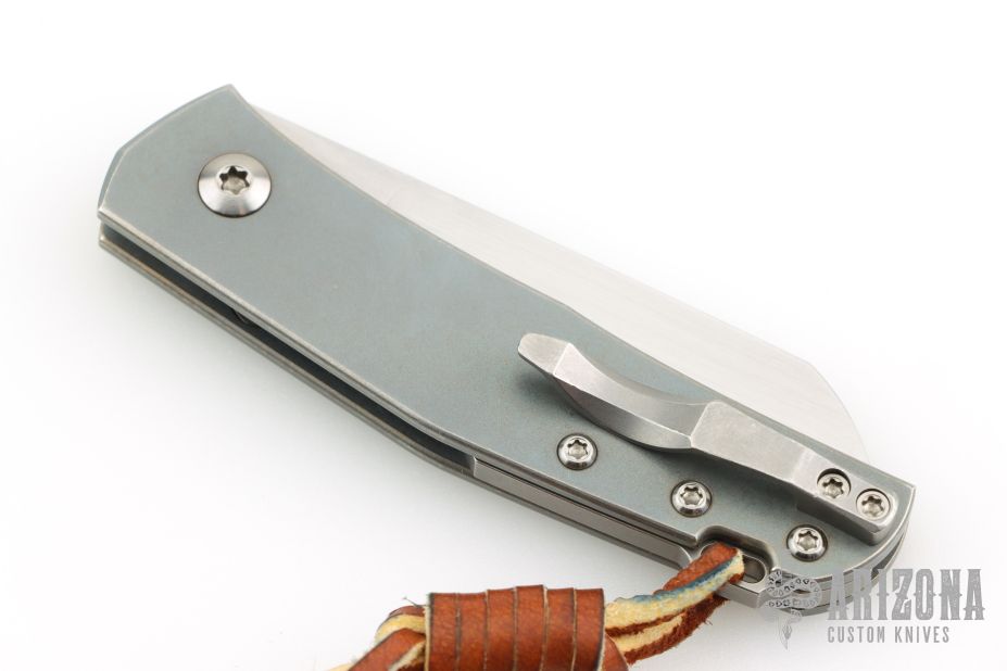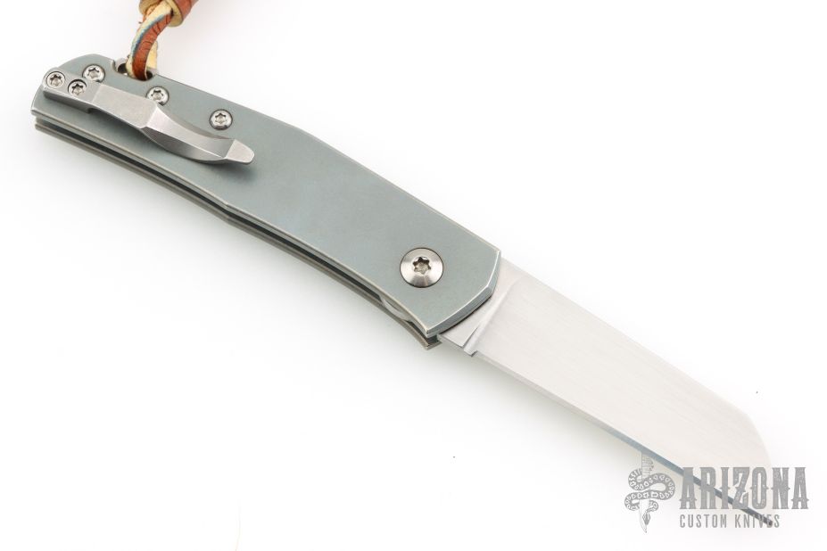 This classy little knife from Jens Anso features a hand rub satin finished wharncliffe blade with nail nick. The handle has an anodized and stonewashed titanium frame, anodized and tumbled titanium tip up clip and backspacer with lanyard hole. Has a double detent mechanism to hold but not "lock" the blade in place. Has a half stop. Perfect blade seating. Comes with a civivi zipper case. Has some light scuffs and scratches, great overall condition.