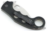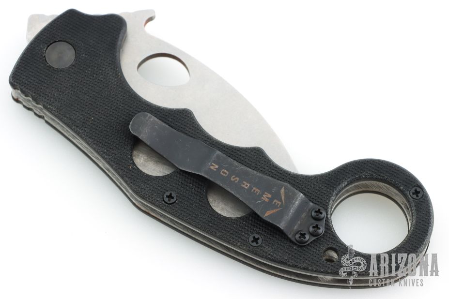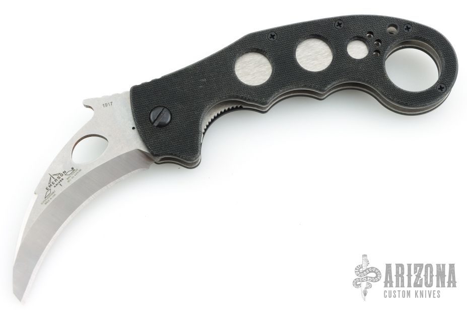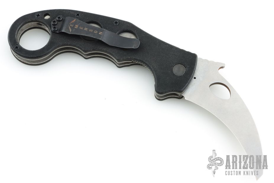 This Emerson Super Karambit has a stonewashed chisel ground hawk bill blade with notched thumbrest, thumbhole, flipper and wave feature. The handle has black G10 scales, titanium liners with and has a lanyard hole at the butt. Also has a black stainless steel clip positioned for right or left-handed tip up carry. Nice detent, lockup and blade seating. Serial number 1917.  Excellent condition.