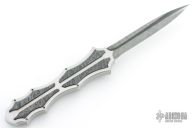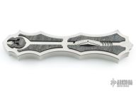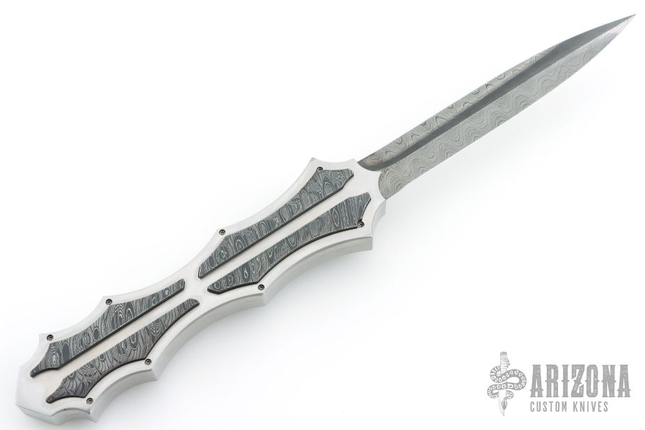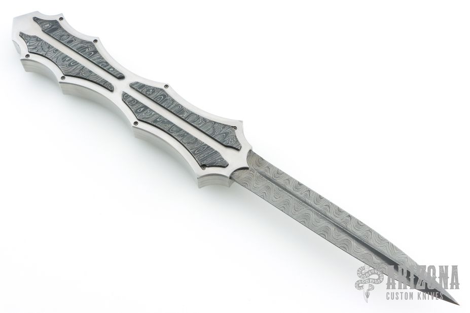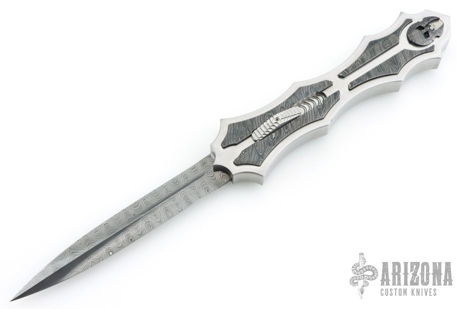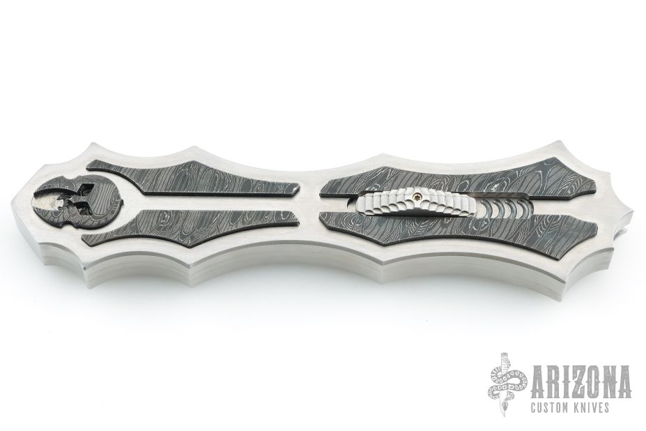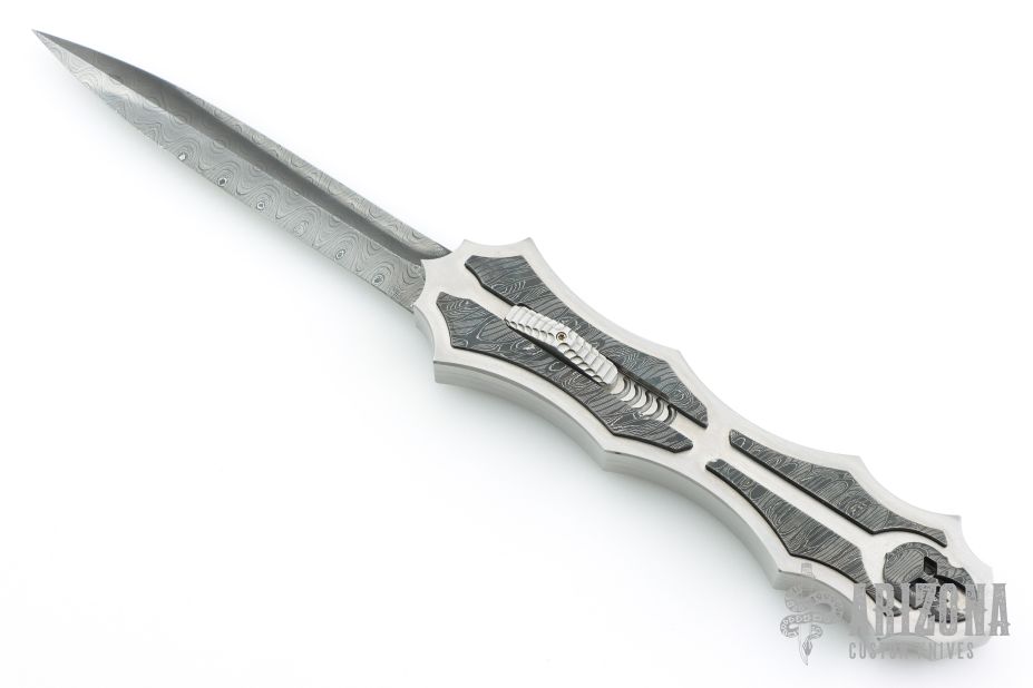 This OTF by Burn Knives features a Damascus (polished hollow ground carbon ladder pattern) double-edged blade. The handle has a satin finished 416SS frame with Damascus (Norris "Fireclone") inlays and milled thumbslide. Nice action and lockup. Has a couple light scratches, otherwise excellent condition. Comes with COA dated 7-29-22.