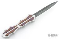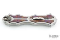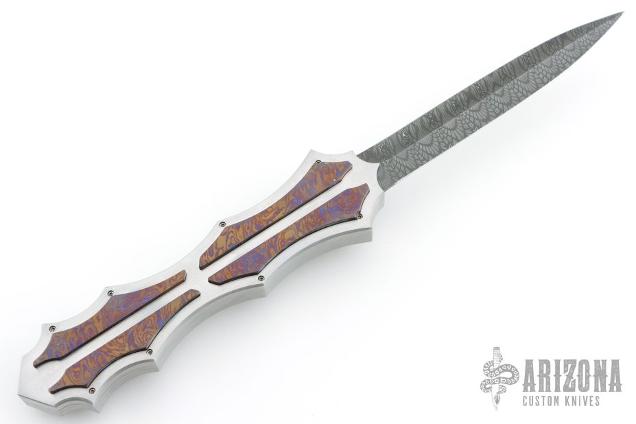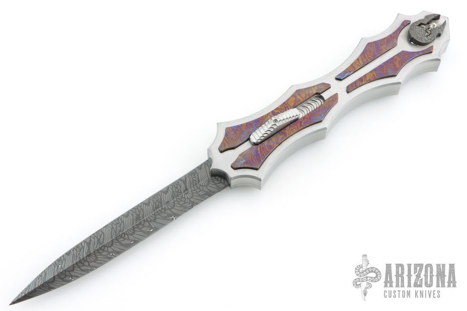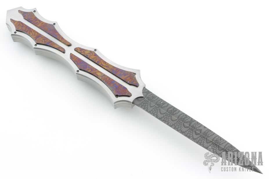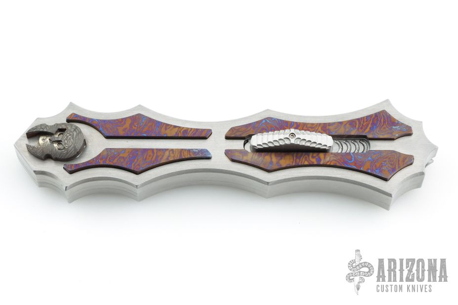 This OTF by Burn Knives features a Damascus (polished hollow ground SS Mike Norris "Fireclone" pattern) double-edged blade. The handle has a satin finished 416SS frame with Timascus inlays and milled thumbslide. Damascus Spartan helmet and sterling silver skull inlay. Nice action and lockup. Has a couple light scratches, otherwise excellent condition. Comes with COA dated 5-21-25.