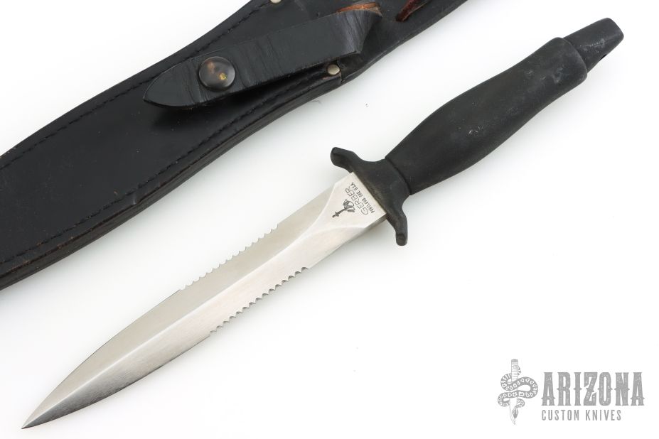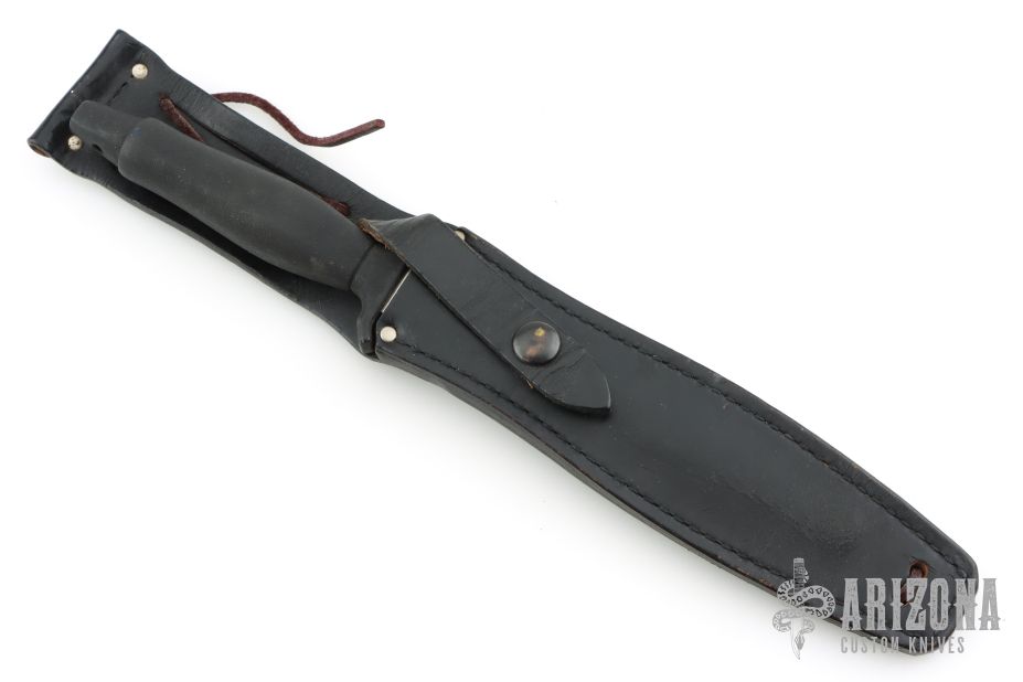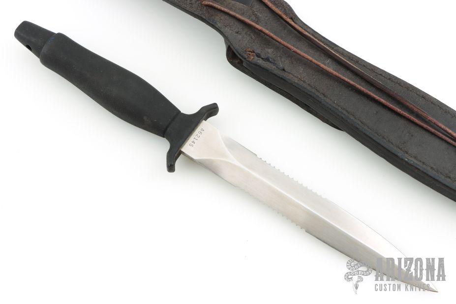 The Mark II is one of the best selling knives of all time. First introduced in 1966, this tactical knife is serialized for collectors. This one has a satin finished hand ground double edged partially serrated blade, .243" blade stock and .944" blade depth, hidden tang construction with a black aluminum handle. This knife is Serial #A6214S and was made in 1982. Comes with a black leather sheath. Has some scuffs on the handle, otherwise excellent condition.