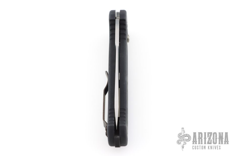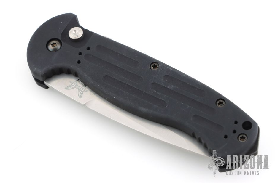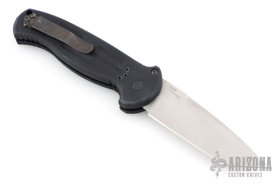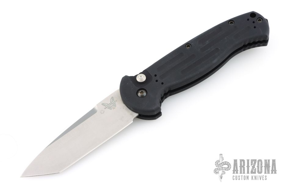 This 9052 AFO II Auto by Benchmade has a bead blasted tanto blade with a false top edge. Black anodized aluminum handle. Integrated safety system. Black stainless steel clip - 4 way reversible, and lanyard hole. Has a few light scuffs and a spot on the blade next to the makers mark, otherwise excellent condition.