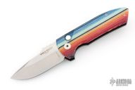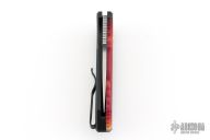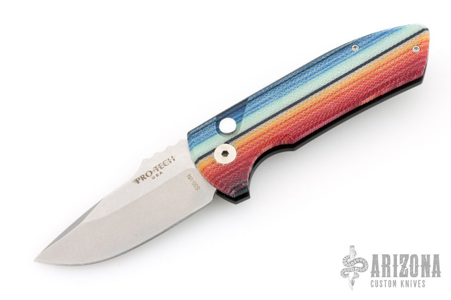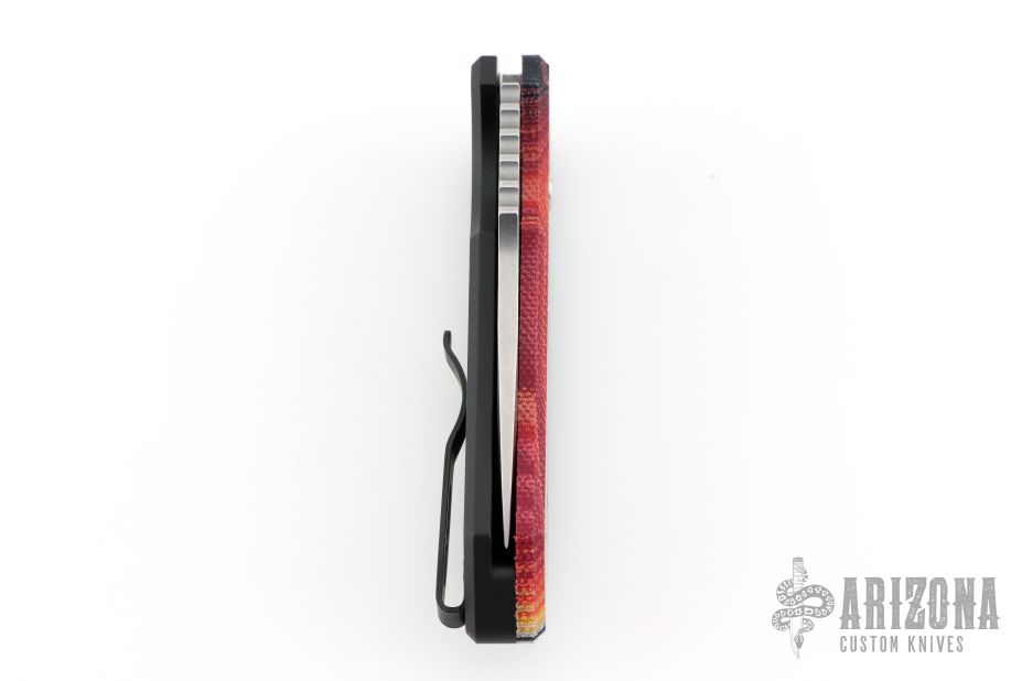 This one has Mexican Blanket Micarta front scale with mother of pearl inlaid push button, black aluminum frame, tip up stainless steel clip. Comes with original box and papers. Excellent condition.