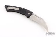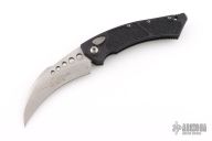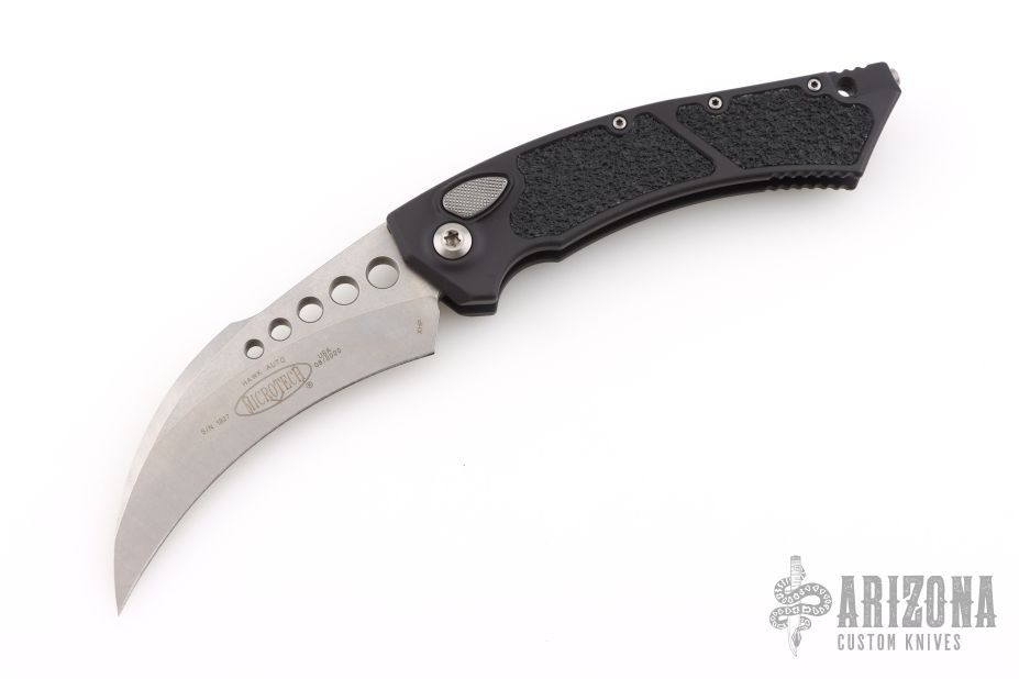 This Hawk Auto by Microtech Knives features a stonewashed hawkbill blade. The handle has a black aluminum frame with blasted stainless steel hardware and tip up clip. Dated 08/2020 and s/n 1327. Excellent Condition. Comes with original box and papers.