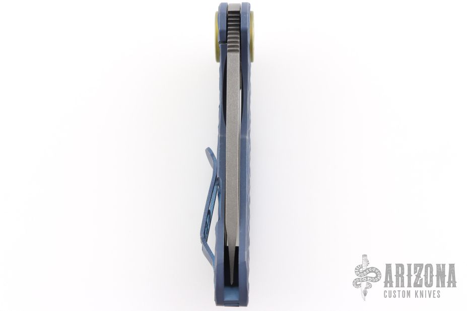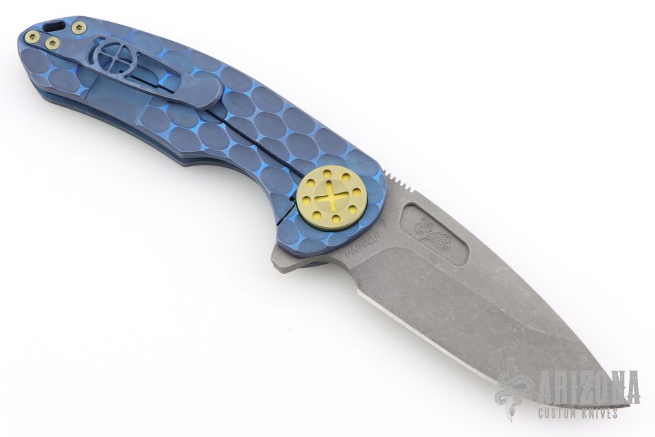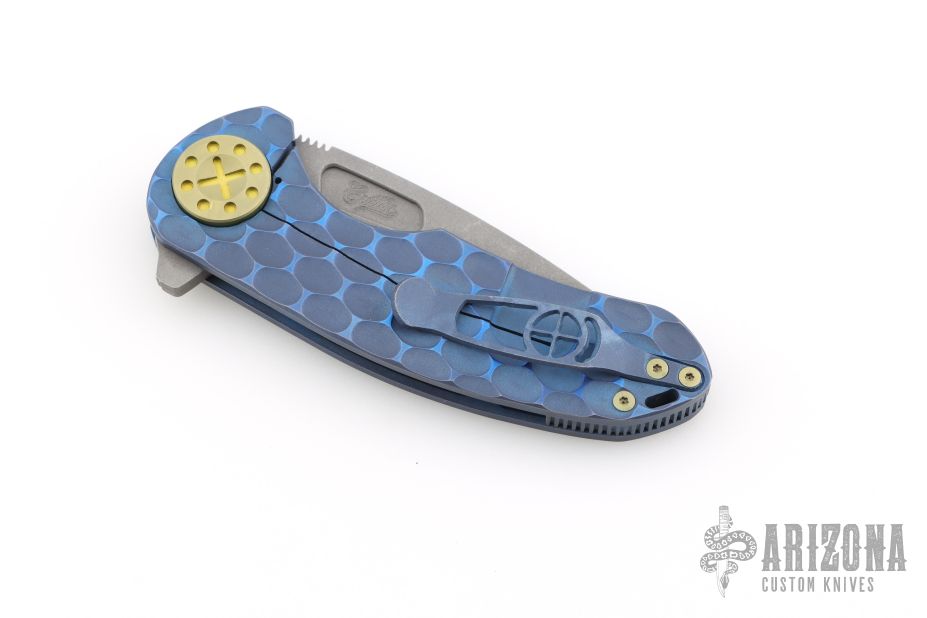 This F3 by Curtiss Knives features an acid stonewash finished Magnacut blade with notched thumbrest and flipper. The handle has a PM-milled and anodized titanium frame with a matching tip up titanium clip.  Rides on bearings, nice detent and lockup.  Comes with original box, zipper case and COA dated 12-14-22.  Excellent Condition.