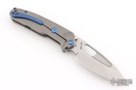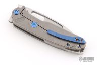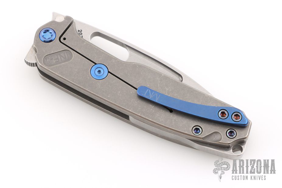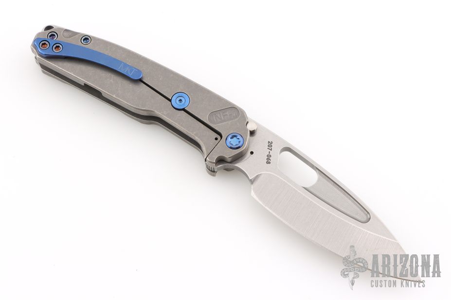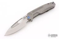 The all Titanium Infraction, by Medford Knife and Tool features a tumbled finished drop point blade with a recess and oversized thumbhole. The handle is composed of tumble finished titanium. The tip up carry pocket clip is composed of titanium. Smooth action and strong detent. Comes with original box, hard case and COA dated Oct 26, 2022. Excellent Condition.