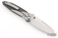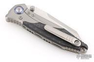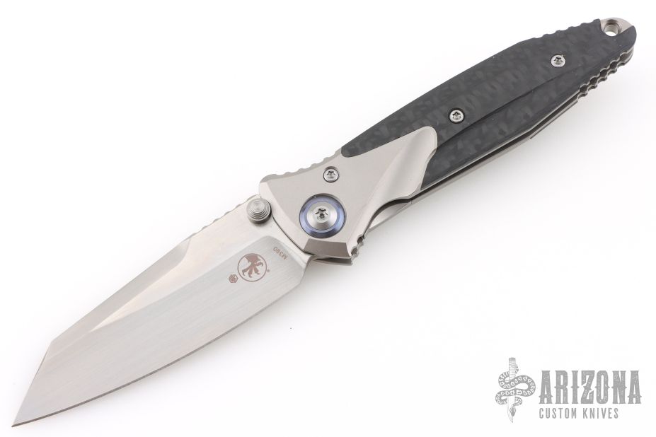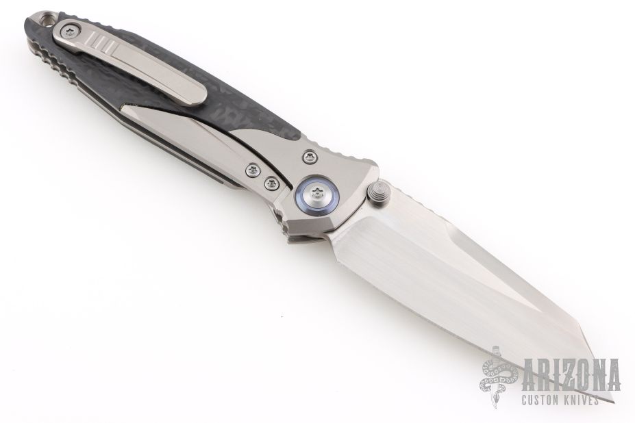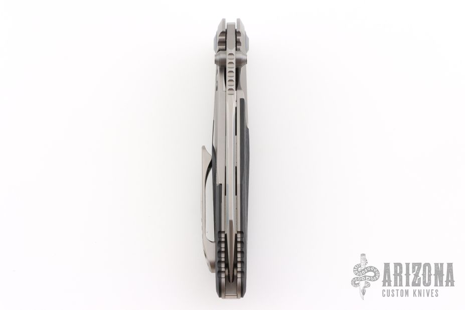 - Handle: Black carbon fiber inlays in a bead-blasted titanium handle and a blue titanium pivot collar.